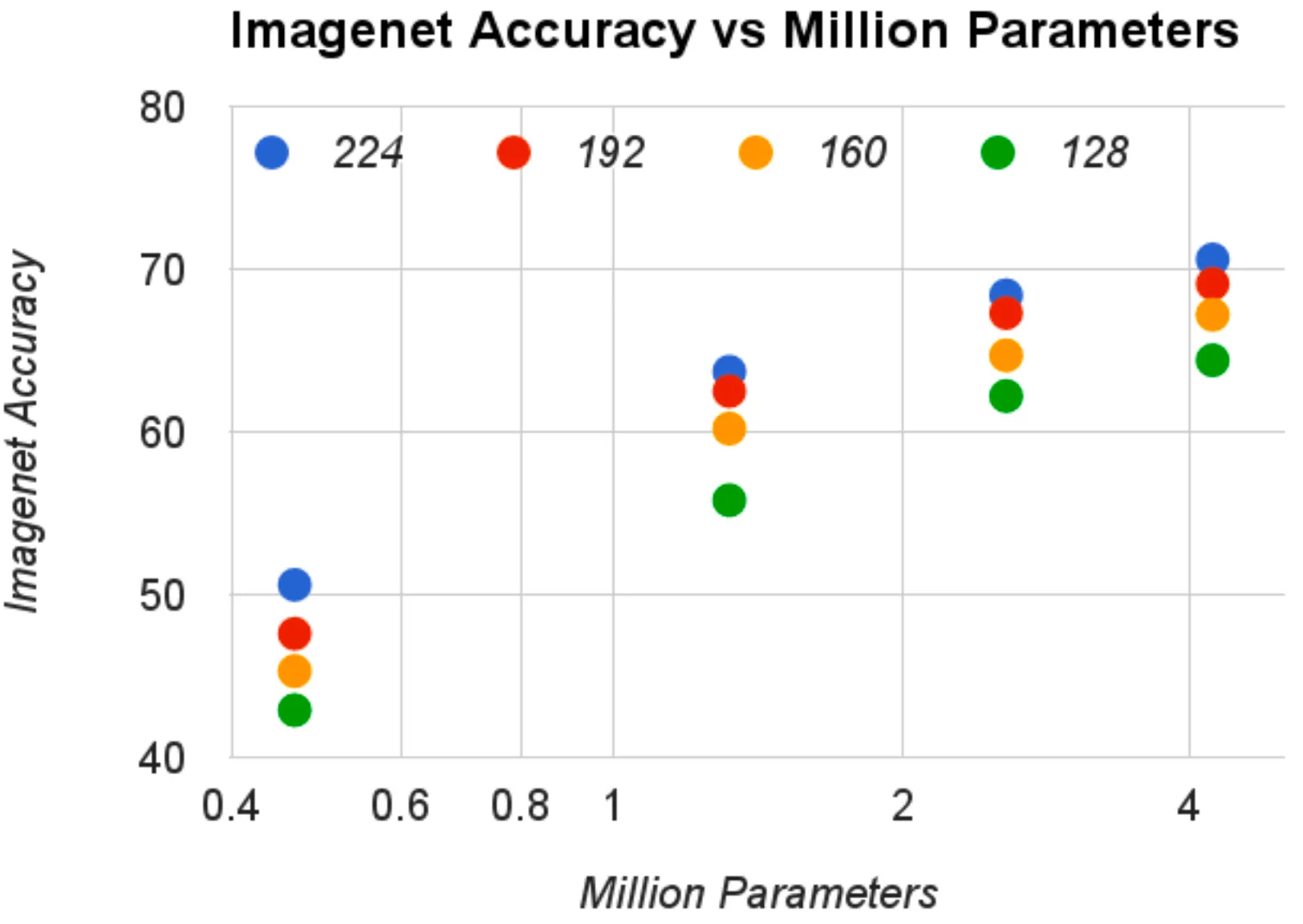 그 결과, multi-adds vs accuracy plot 에서는 를 벗어나는 시점에서 accuracy 의 큰 변화가 나타났고, 전체적으로는 log-linear 한 양상을 보였습니다. 이와 비슷하게 parameters vs accuracy plot 에서도 가장 작은 resolution 에서 다음 resolution 으로의 gap 이 큰 것을 확인할 수 있었습니다. 이 관계에 대한 자료는 논문의 width multiplier, resolution multiplier 가 smooth 한 accuracy 의 감소를 가져오는 것을 가시적으로 보여줍니다.
