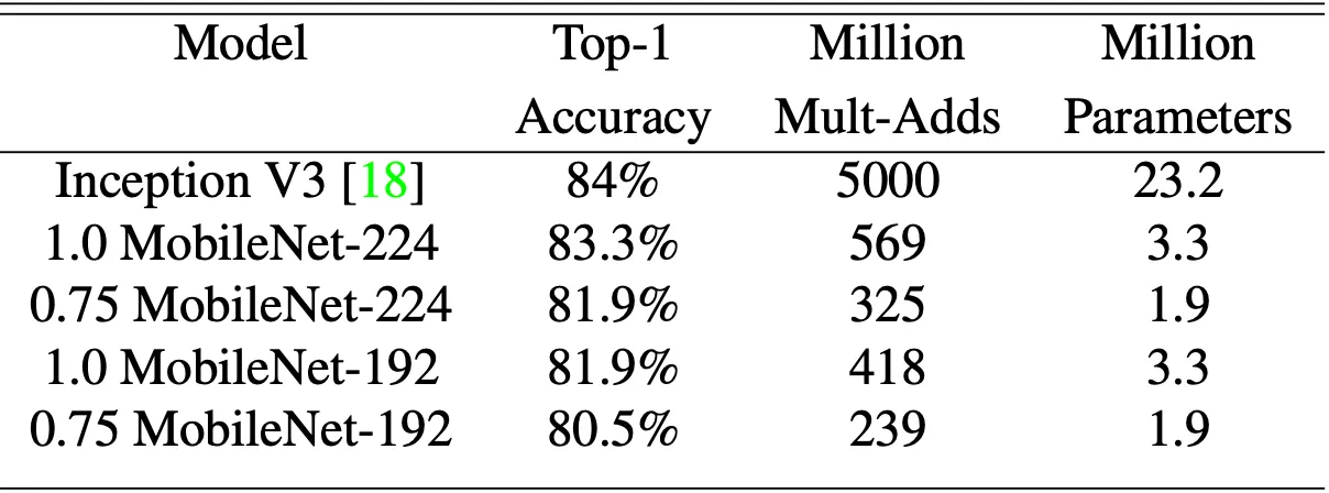 위 표는 Input 으로는 이미지를, kernel 로는 를 사용하여 측정한 computational cost 와 parameter 수입니다. Depthwise Seperable Convolution, width multiplier , resolution multiplier 를 실제 적용했을 때 computational cost 와 parameter 의 수를 얼마나 줄여주는지를 살펴볼 수 있습니다.