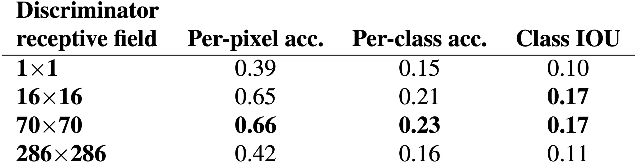 ํ์์ ๋ณด์ด๋ ๋ฐ์ ๊ฐ์ด 70x70์ patch size๋ก ๋๋์ด ์ง์์ฌ๋ถ๋ฅผ ํ๋จํ ๊ฒฝ์ฐ๊ฐ ๊ธฐ์กด์ 1x1์ pixelGAN์ด๋ 286x286์ imageGAN ๊ตฌ์กฐ๋ณด๋ค ๋ ๋์ FCN-score๋ฅผ ๋ณด์์ ์ ์ ์์ต๋๋ค. ์ด๋ ์์ ์ค๋ช