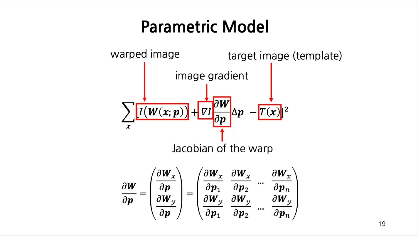 와 의 SSD 를 최소화하하도록 align 하는 warping parameter 를 찾아야 함.