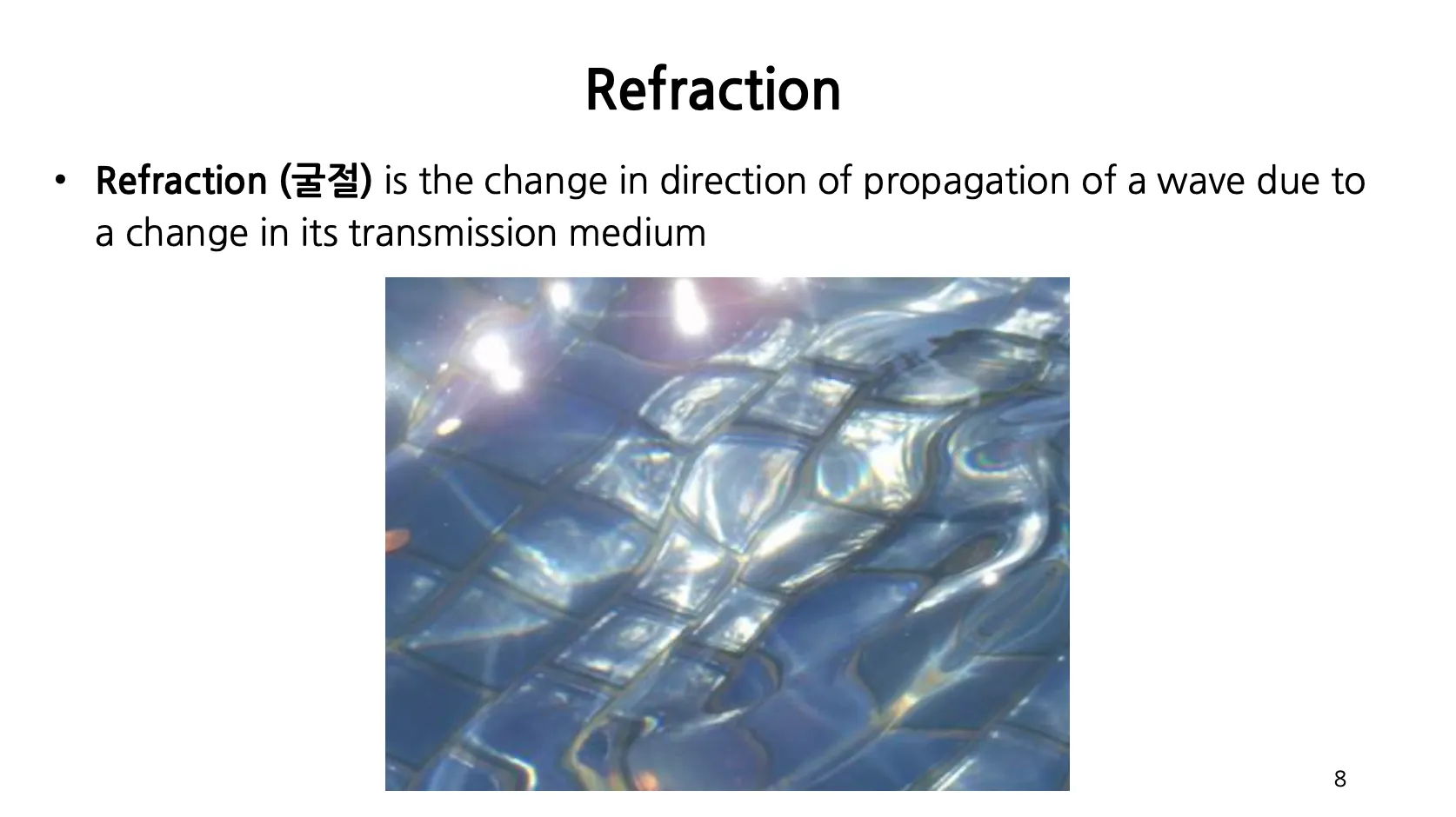 사진의 물 밑의 바닥은 정사각형 형태의 타일의 연속인데, Refraction 에 의해 찌그러져 보임.