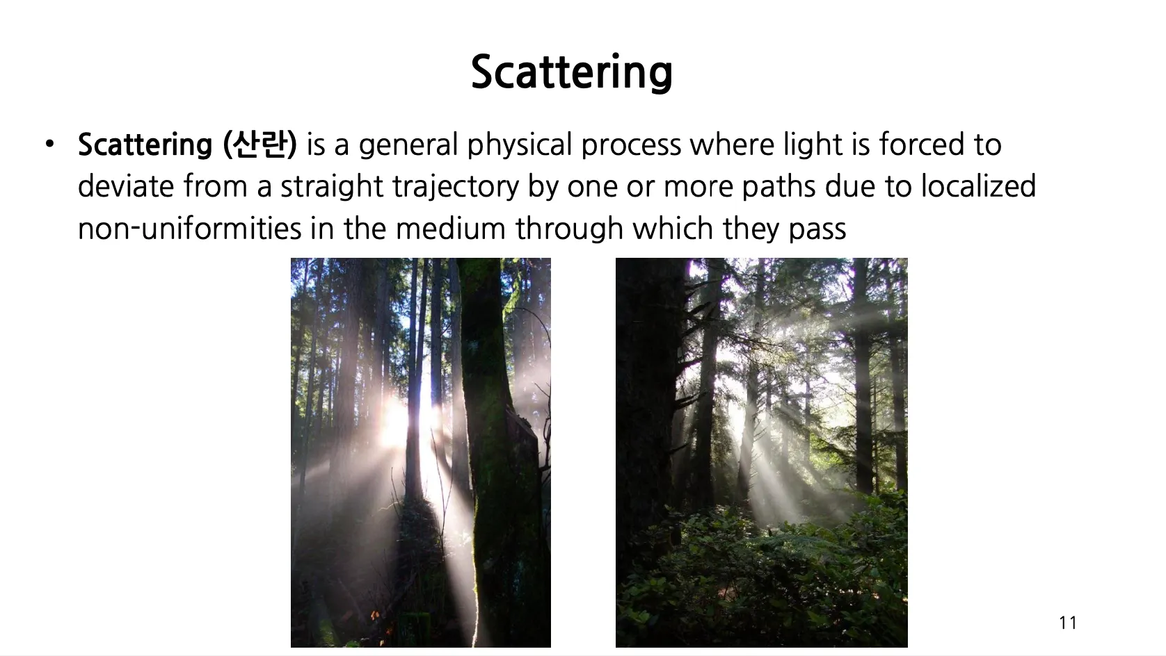 Scattering (산란) 은 숲 같은 곳에 작은 물방울들의 불균형성 의해서 빛의 경로가 꺾이고, 사방으로 흩어지게 되는 현상임.