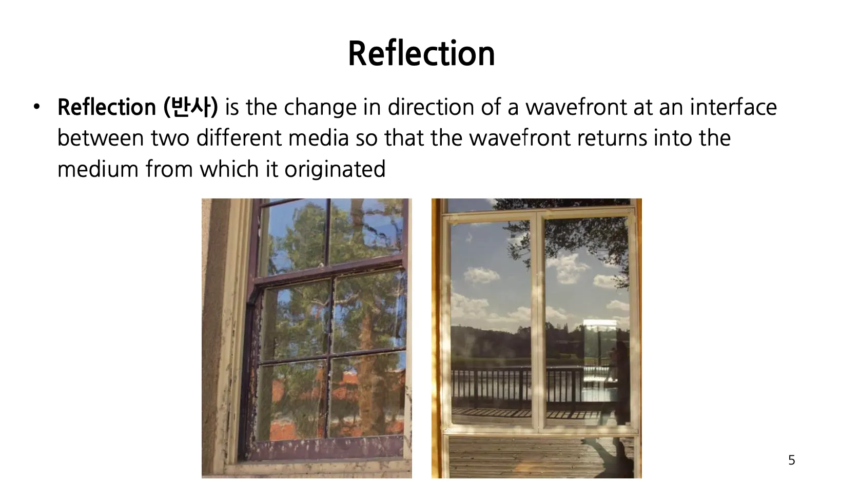 Reflection (반사) 는 서로 다른 두 매질의 인접한 부분에서 빛의 진행 방향이 반대로 바뀌는 현상임.