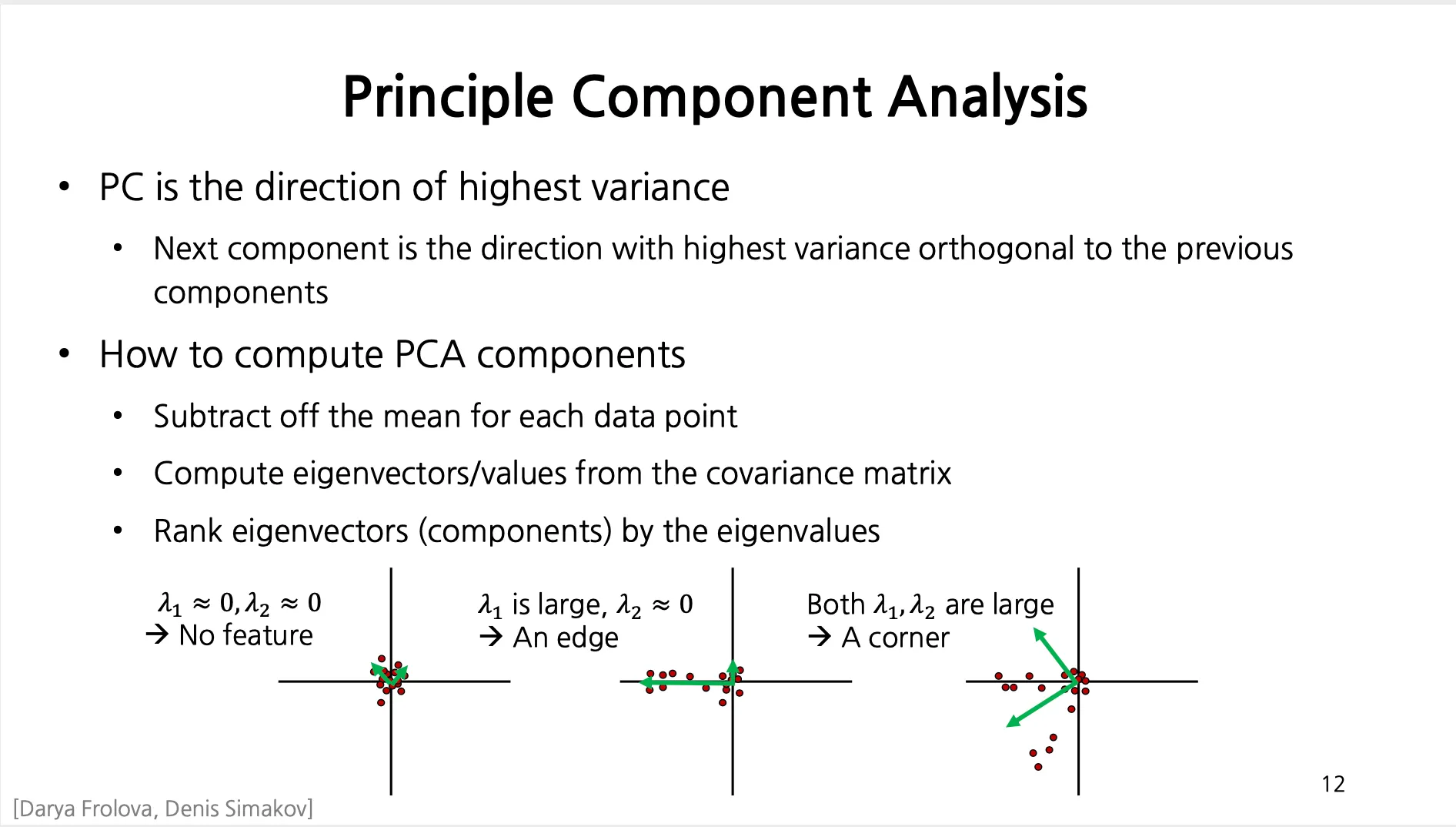 각 지점마다 사각형 영역을 잡고, 해당 영역 내의  방향 및  방향 gradient 를 계산하여 2차원 공간에 표현한 뒤에 PCA 를 거치면, 해당 지점이 Flat 인지, Edge 인지, Corner 인지 알 수 있음!