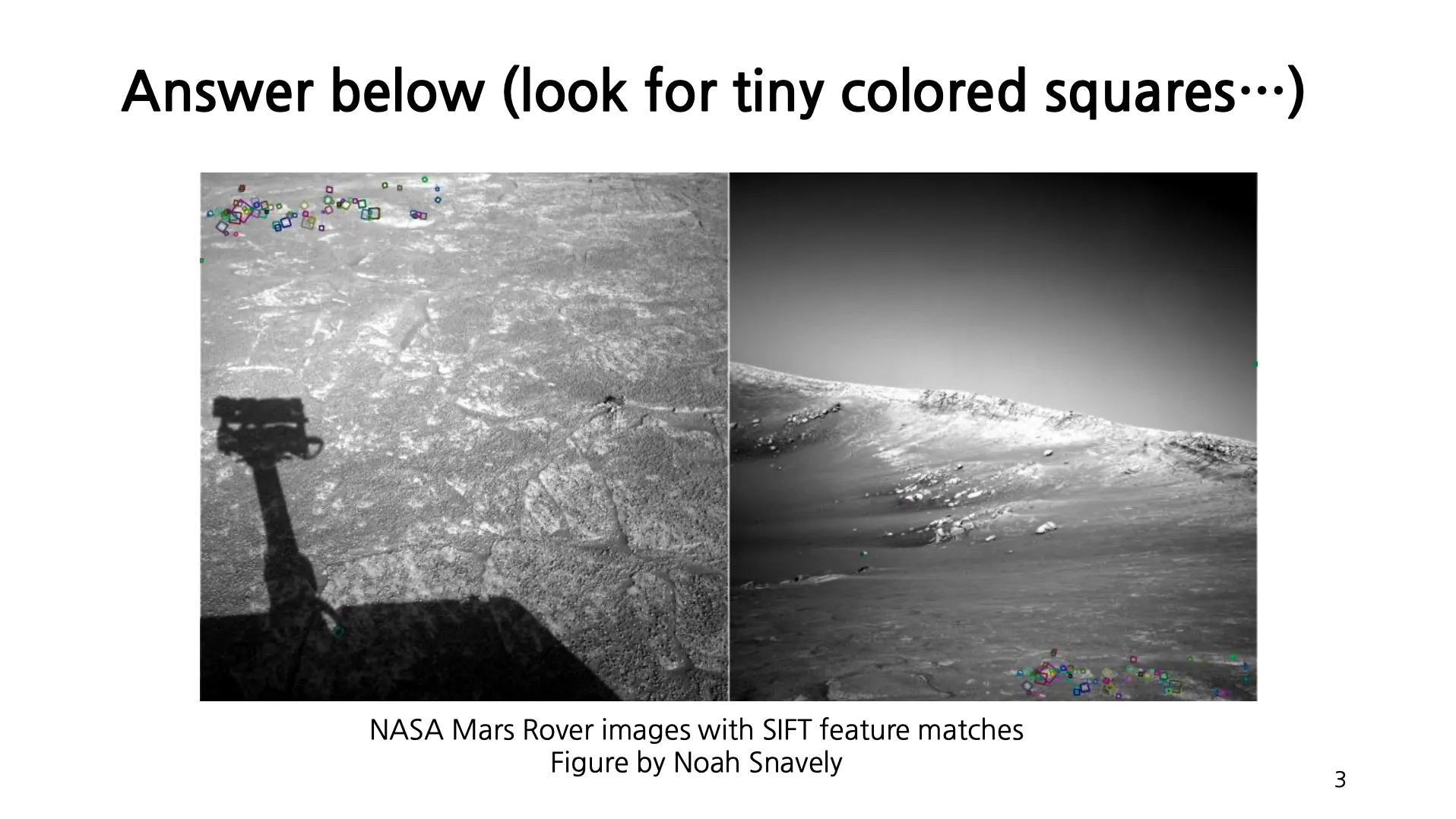 하지만 SIFT Feature 를 뽑아서 비교해보면 겹치는 부분을 찾기 어려웠던 두 사진 속에서도 겹치는 부분을 찾을 수 있음.