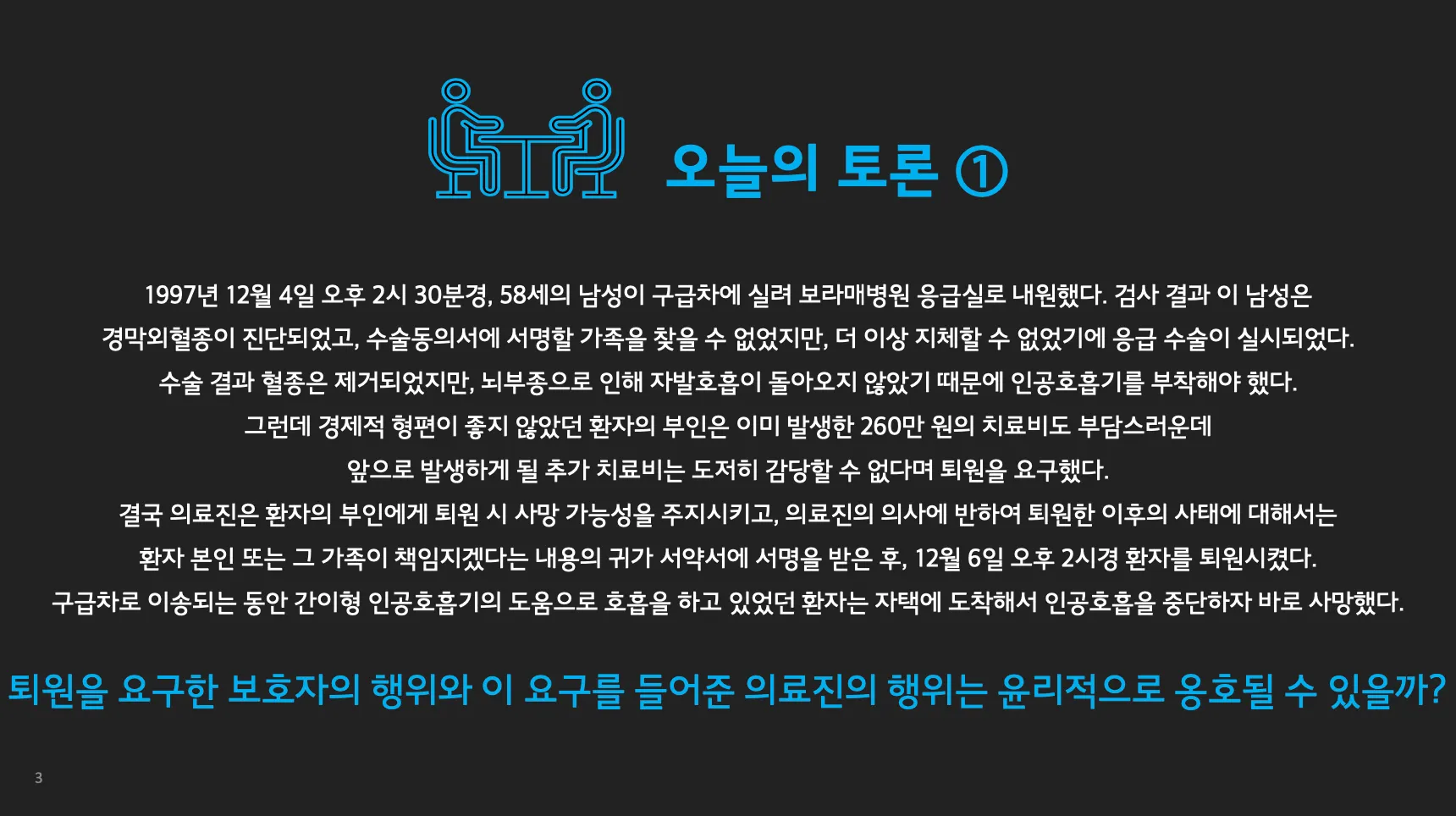 하지만, 여기서 고민이 될 수 있는 부분은 보호자 및 환자 부부가 환자의 지속적인 치료를 감당할만한 재력을 보유하고 있지 않았다는 점입니다. 이 지점 때문에 보호자의 행위를 “안쓰럽다”거나 “어쩔 수 없었다” 는 시각이 생길 수 있으며 윤리적으로 옹호될 수 있는 가능성을 만들어주는 것이라고 볼 수 있습니다.
