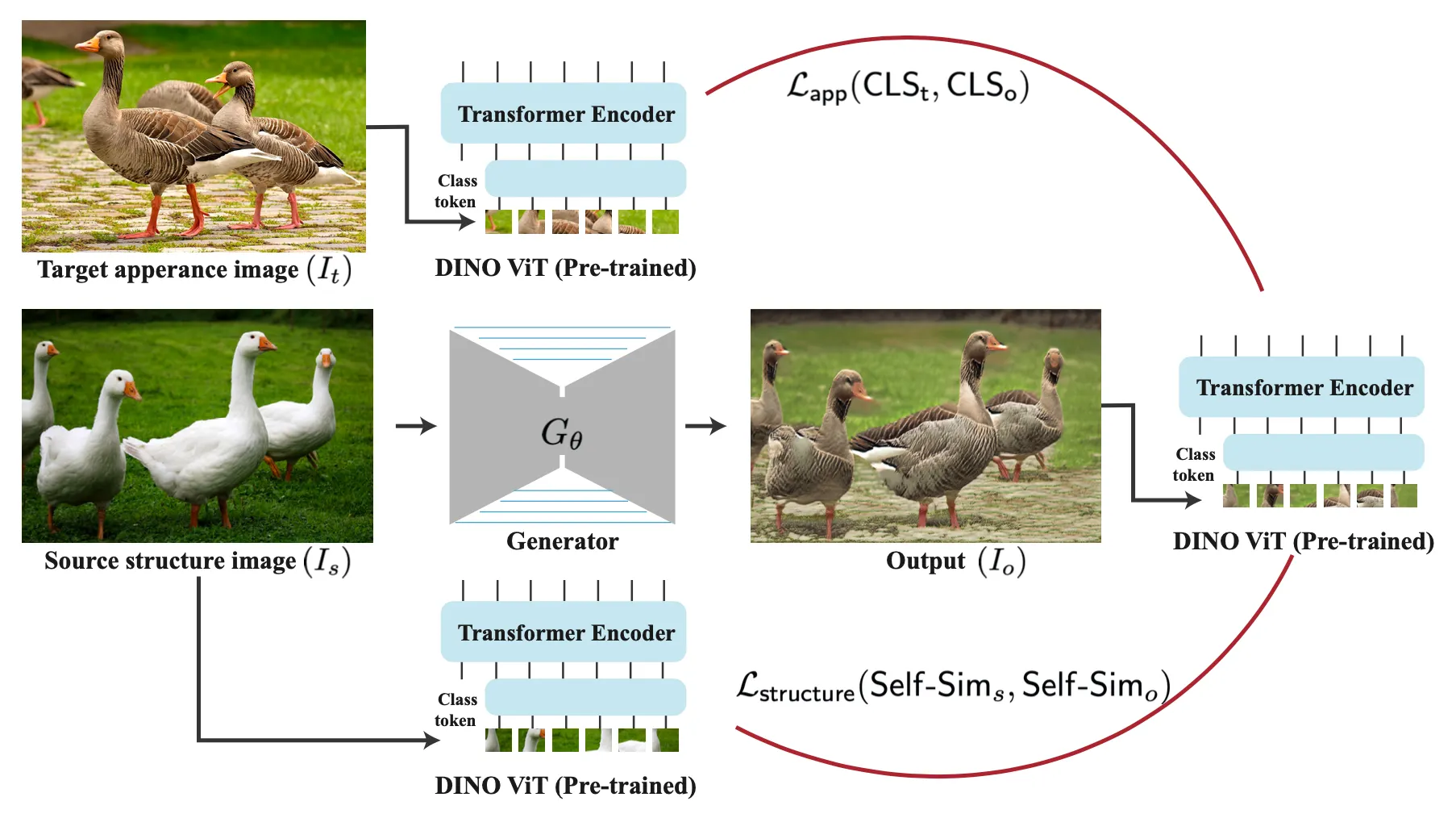 논문에서는 Source Structure Image 인 와 Target Appearance Image 인 가 입력으로 들어 올 때 의 구조를 가지면서 의 외관을 가진 최종적인 Output Image 를 생성하는 것을 목적으로 합니다. 이를 위해 앞서 잠깐 언급했던 DINO-ViT 의 encoder 를 prior 로 사용했고, encoder 의 특정 feature 를 추출하는 형태로 loss 를 선언하여 generator 를 학습하게 됩니다.
