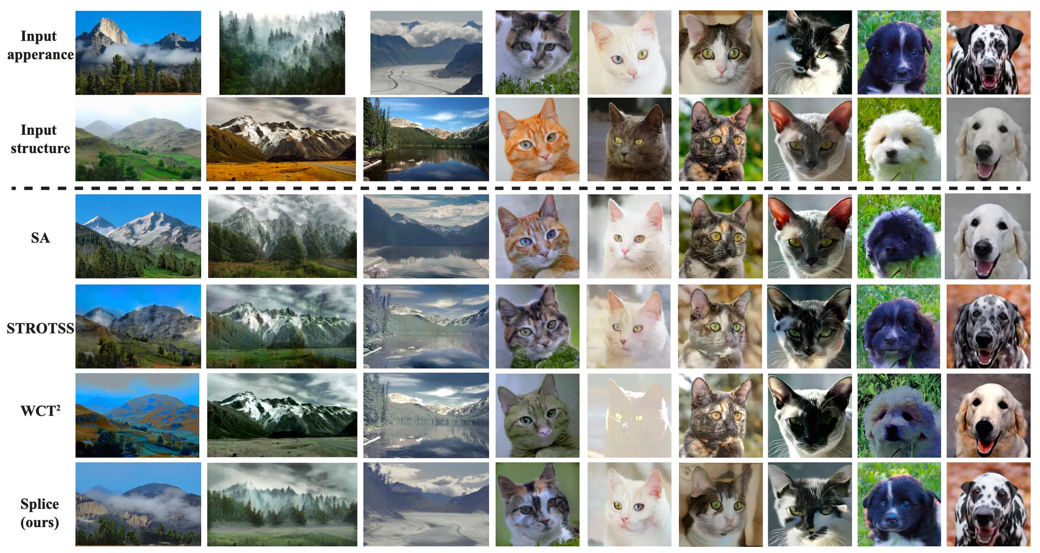 위 그림에서 볼 수 있듯이 은 풍경을 기반으로 한 이미지에 대해서는 잘 동작하지만 백조의 구조를 가지는 이미지를 흑조로 바꾸는 경우에서 볼 수 있듯이 고차원의 시각적 정보를 전이할 수 있는 능력은 부족함을 확인할 수 있습니다. 반면 논문의 방법론은 의미적으로 관계를 가지는 영역들에 대한 정확한 매치를 통한 전이를 성공한 모습을 볼 수 있습니다.