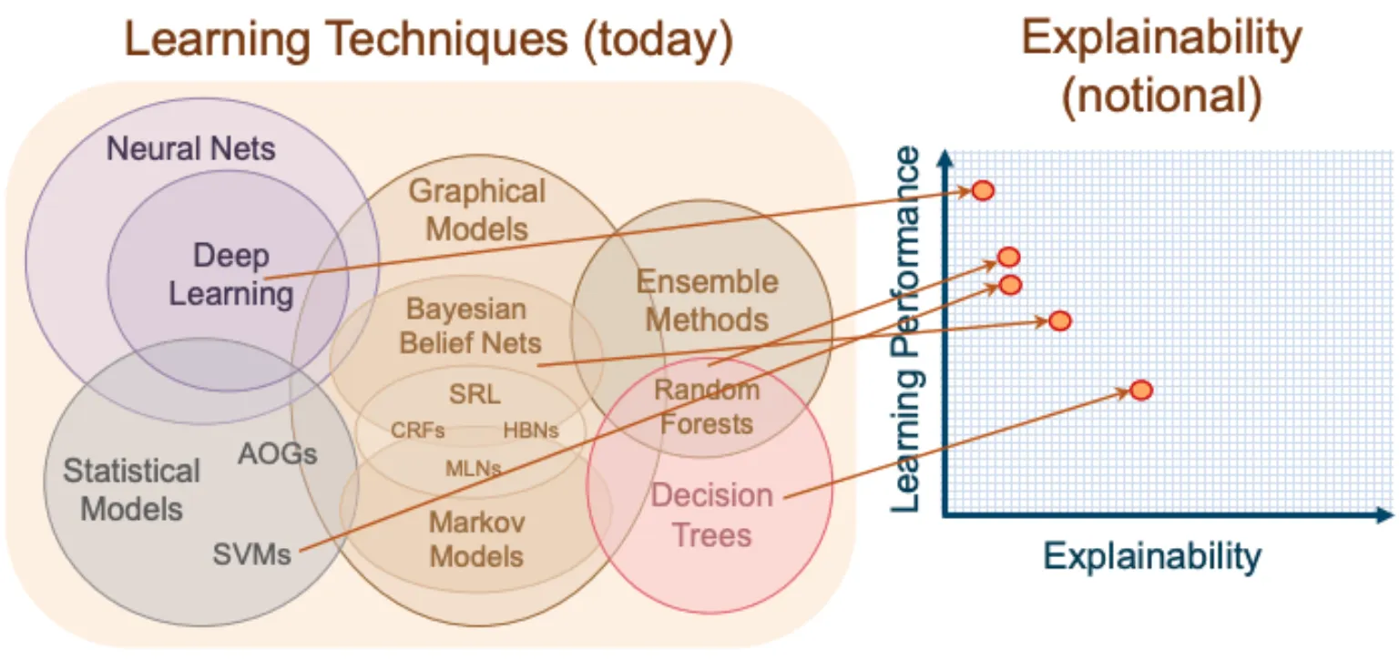모델의 복잡성에 따라서 설명가능성이 달라지는 것은 Learning Technique 에 따른 설명가능성으로 예시를 들어 설명할 수 있습니다. Deep Learning 과 같은 학습 기법은 설명가능성이 매우 낮은데 비해서, decision tree 와 같은 기법은 특정 기준에 따른 판단의 분류이기 때문에 설명가능성이 높습니다.