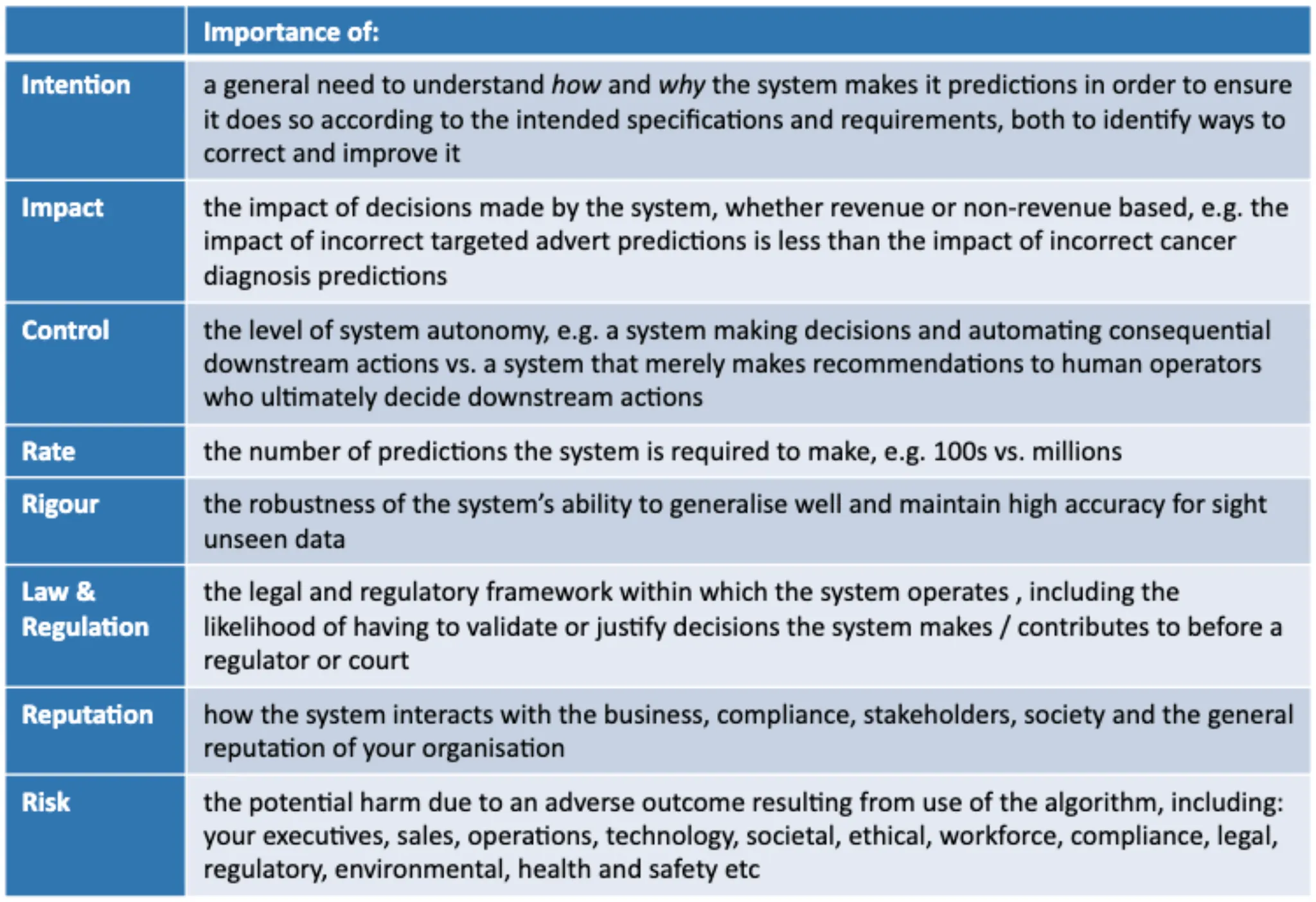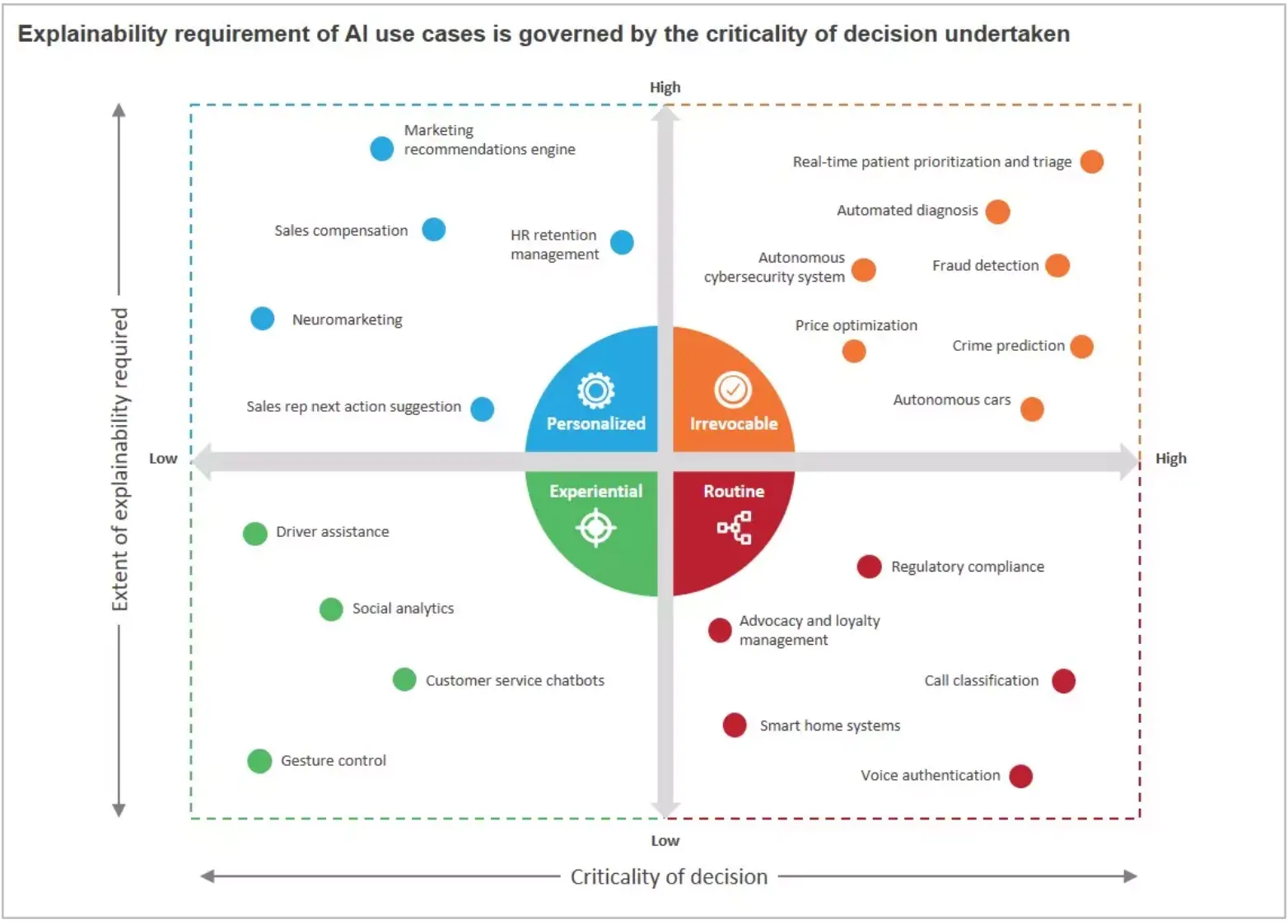 위 그림은 Criticality 와 Necessary Explainability 에 따라 AI usecase 들을 분류한 것입니다. 간단하게 살펴보면 자율 주행차의 경우 우측 상단에, 챗봇 같은 경우 좌측 하단에 있는 것을 볼 수 있습니다.