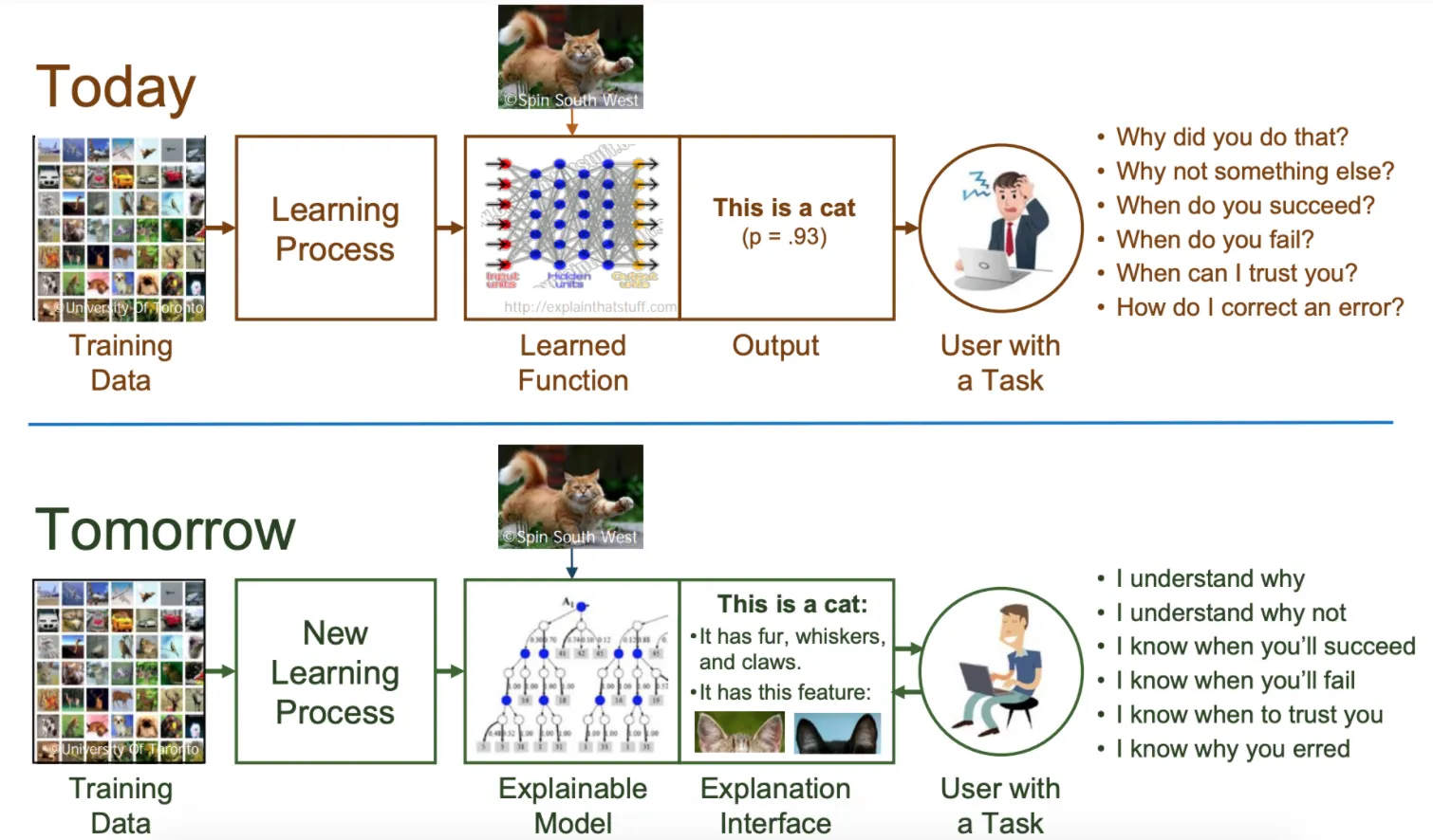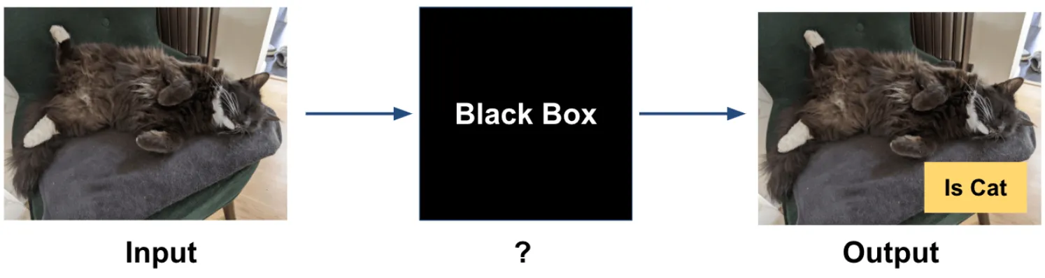 위의 그림과 같이, 개/고양이 분류기에 고양이 사진을 넣어서 결과로 이 사진이 고양이 사진이라는 것을 얻을 수는 있지만, 안에서 어떤 과정이 일어났기에 고양이라고 결론 지을 수 있는지에 대해서 알 수 없다는 말입니다.