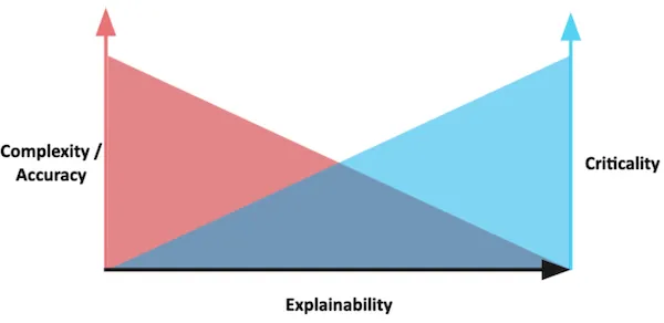 그런데, 눈치가 빠르신 분들은 이 두가지 요소가 서로 상충된다는 점을 아실 수 있으실 것입니다. 위 그림과 같은 양상으로 그래프가 합쳐진다는 것입니다. Complexity 를 욕심낸다면, Explainability 를 어느정도 포기해야하고, Criticality 가 높은 문제에 대해서 다루려면 Explainability 를 챙겨야하기 때문입니다. 즉, 높은/민감한 중요도의 문제를 해결하는 모델에 대해서는 높은 설명가능성을 부여해야 하고, 그만큼 Complexity 를 낮게 가져가도 됩니다. 이 경우는 자율주행 시스템 같은 예시가 있습니다. 반대로, 낮은 중요도의 문제를 해결하는 모델에 대해서는 굳이 높은 설명가능성을 부여할 필요가 없고, 그만큼 Complexity 를 높게 가져가 정확도를 높여도 됩니다. 이 경우는 개/고양이 분류기 같은 예시가 있습니다.