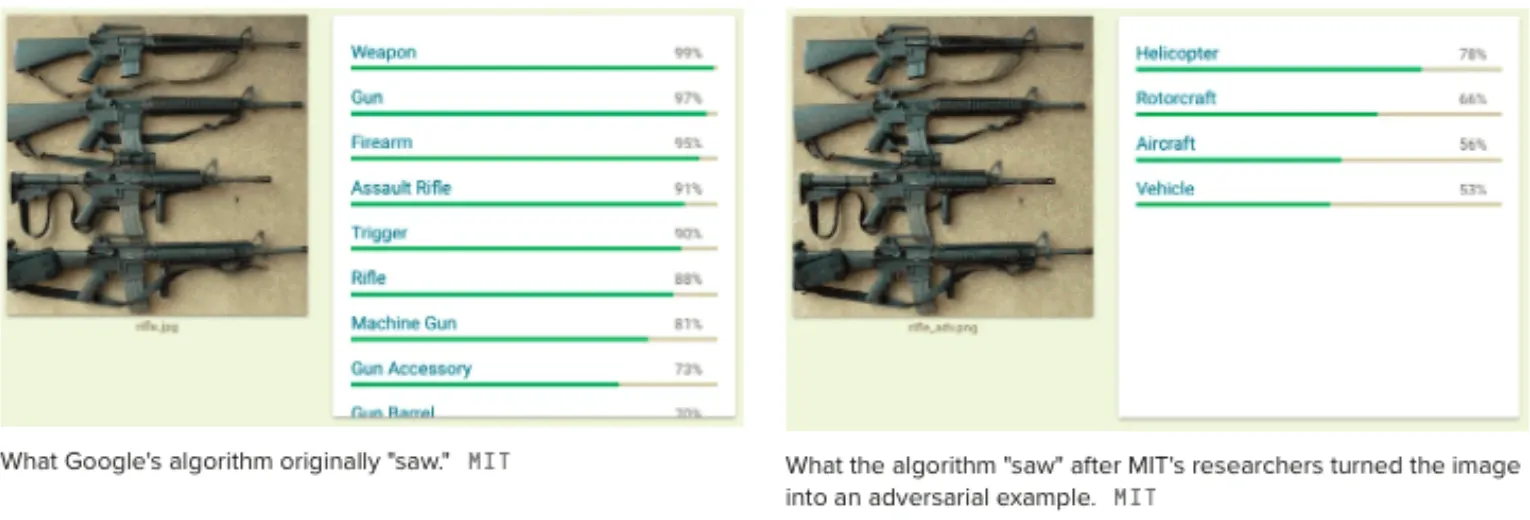 위의 예시는 강아지 사진에서부터 픽셀을 미세하게 조정하여 스키타는 사람들 그림으로 바꿔버리는 경우입니다. 실제로 악의적으로 개 라고 판단하기를 바라면서 오류를 발생시키는 경우인 것입니다. 이러한 경우는 특히 픽셀 자체에 의미를 알지 않는 한 왜 모델이 실패했는지에 대해서 모를 것입니다. 이러한 상황들에서 반대로 XAI 는 실패의 원인을 알고 핸들링하는데 큰 도움을 줄 수 있습니다.