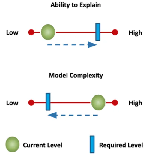 그리고, 이렇게 각 모델의 필요 설명 가능성과 현재 설명가능성을 정의할 수 있게된다면, 모델을 어떤 식으로 바꾸어야 하는지에 대한 계획을 세울 수도 있습니다. 위 그림처럼 Explainability 가 Necessary Explainability 가 작은 경우에는 모델 커스터마이징으로 어느정도의 Explainability 를 확보해야 하고, Explainability 가 Necessary Explainability 보다 큰 경우에는 정확도를 위해 모델 Complexity 를 증가시켜야 합니다.