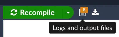 만약, tex 오류가 있다면 해결해야 합니다. 오류의 여부 및 사항은 Recompile 버튼 옆 (Logs and output files) 에서 확인할 수 있습니다. (오류가 존재하면 붉은색으로 표시됩니다.)