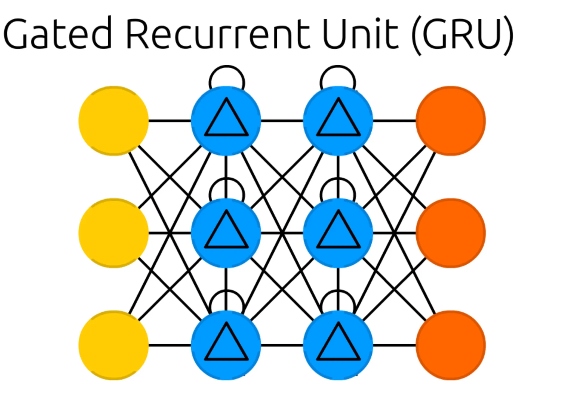 가장 먼저 보이는 구조의 특징적인 변화는 Recurrent Cell 이 있던 위치에, 내부에 정삼각형이 그려진 다른 Cell 이 존재한다는 점입니다. 이러한 형태의 Cell 을 Gated Memory Cell 이라고 합니다. 이전 RNN 이나 LSTM 때와 마찬가지로, Input Cell 과 Output Cell 및 Memory Cell 의 개수는 구조와 관련이 없다는 점 알아주시면 좋을 것 같습니다.