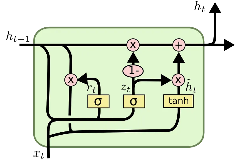 Sigmoid 에 의해 0~1 사이의 값을 가지는 Reset Gate 가 이전 timestamp 의 hidden state 에 곱해져 이 값을 바탕으로 candidate hidden state 를 형성하는 것을 볼 수 있습니다.