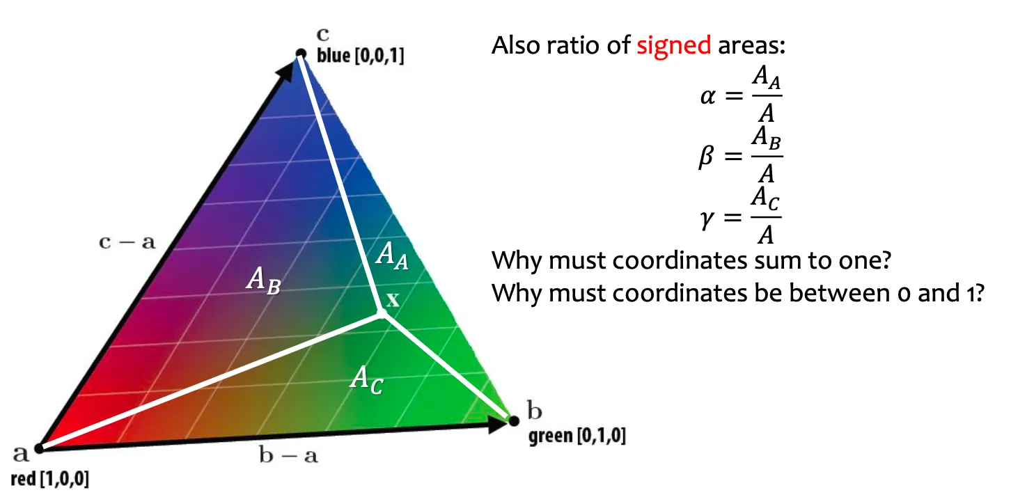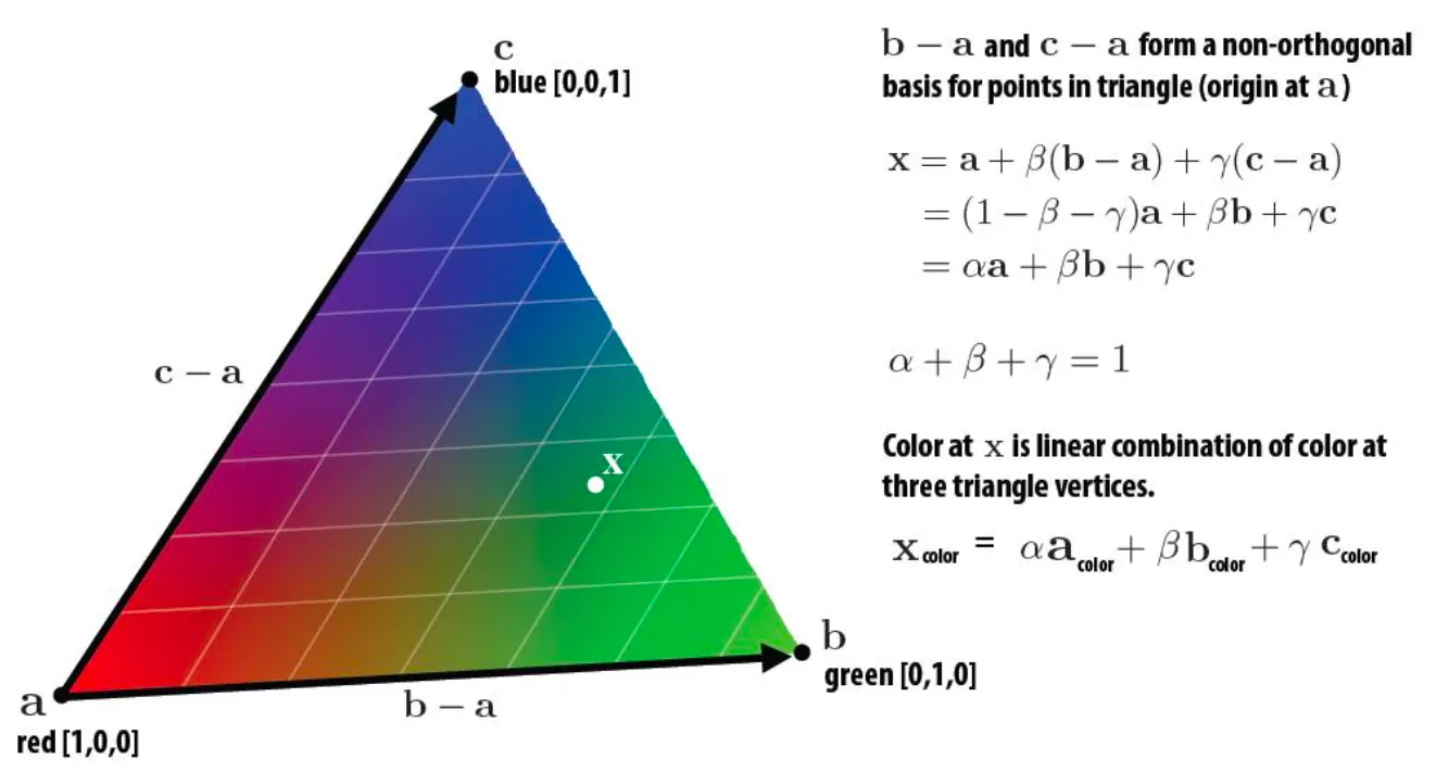 삼각형 안에서는 barycentric coordinate 로 interpolation 을 수행할 수 있음.