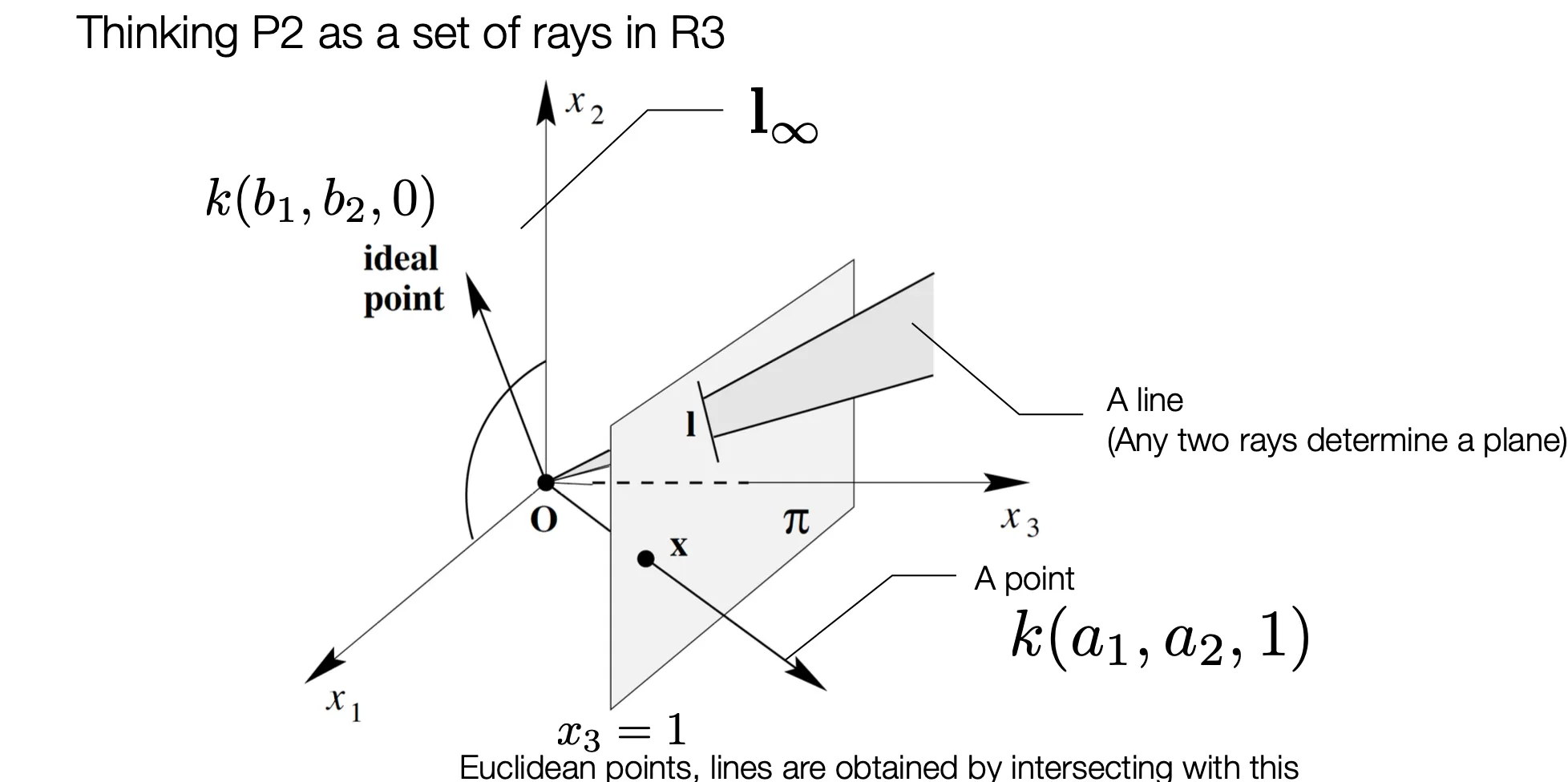 Projection Space 상의 point 는 Euclidean Space 상의 ray 에 대응됨.