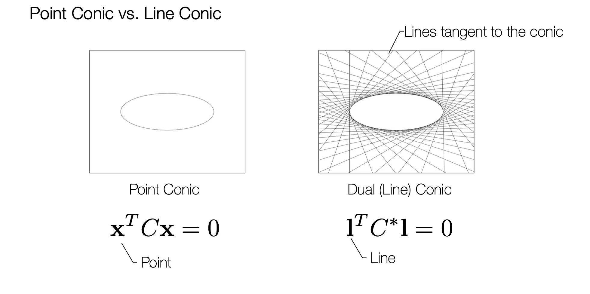 Conic Equation 을 만족하는 3차원 벡터가 Point 일 것이나 Line 일 것이냐에 따라서 Point Conic 과 Dual Conic 으로 나누어짐.