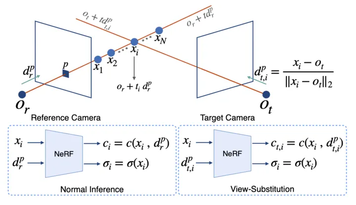 They use volume rendering in refernce view with target view color and obtain residual between the rendering in refernce view with reference view color.