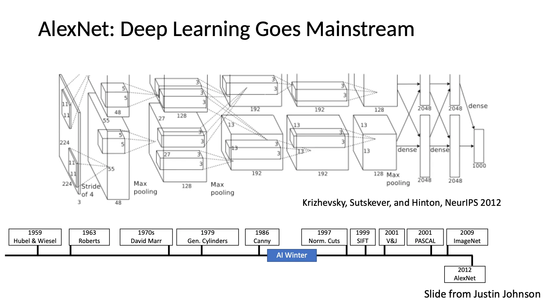Roberts (The Summer Vision Project) → David Marr (Stages of Visual Represenatation) → Recognition via Parts (1970s) → Recognition via Edge Detection (1980s) → Recognition via Grouping (1990s) → Recognition via Matching (2000s) → Face Detection → PASCAL Visual Object Challenge → ImageNet → AlexNet (Deep Learning)