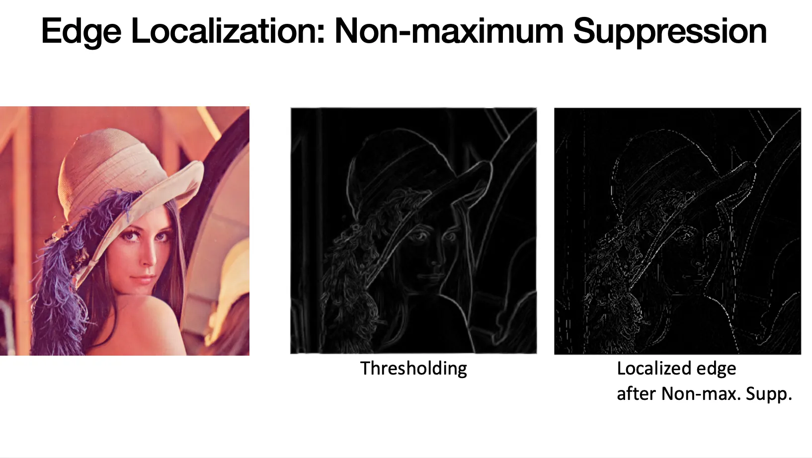 Threshold 를 넘어 edge 로 선언된 각 픽셀별로, 해당 픽셀이 가진 gradient direction 의 양쪽 방향으로 이동하여 찾은 두 개의 neighbor pixel 과 gradient magnitude 를 비교하여 본인이 가장 높은 값을 가지지 않으면 해당 픽셀은 edge 에서 박탈함
