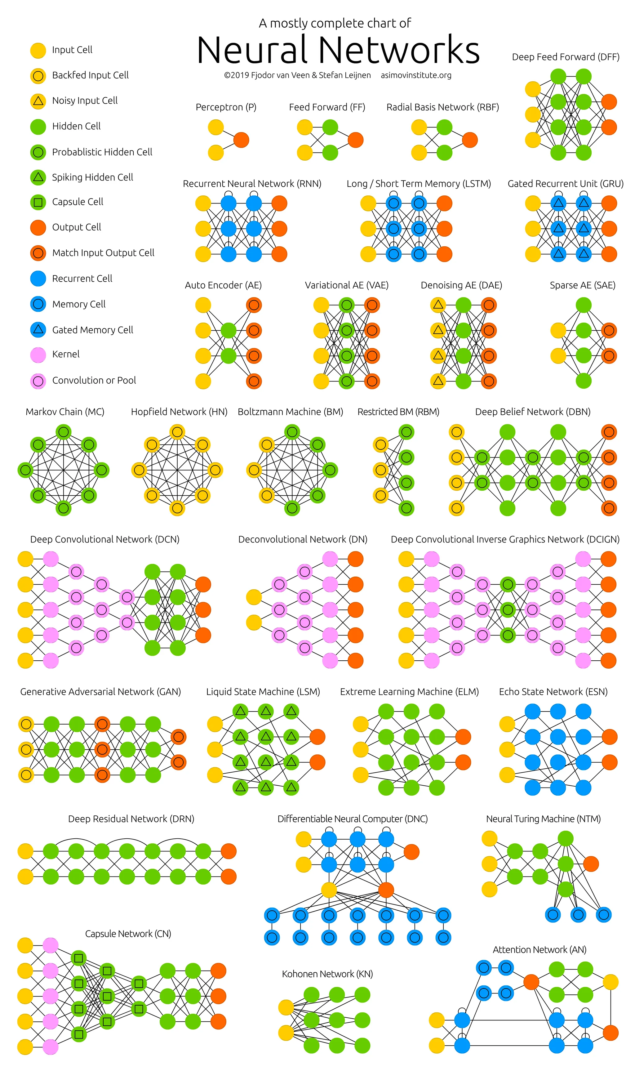 제가 참고한 자료는, A mostly complete chart of Neural Networks 와, 이에 대한 요약을 한 The Neural Network Zoo 입니다. 찾아보니, The Asimov Institute 란 곳에서 만든 자료인데 AI 와 창의성을 접목하여 다양한 아이디어를 제시하고 건축가, 그래픽 디자이너, 패션 디자이너, 마케터 및 음악 제작자 등에게 도움이 되는 다양한 자료 및 툴을 제작한다고 합니다.