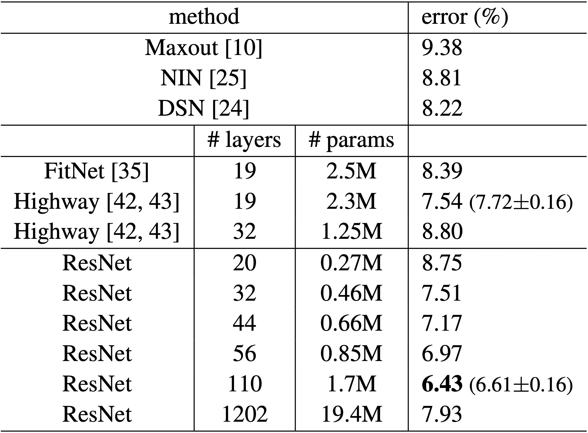 ผ๋ฌธ์์๋ 1202๊ฐ์ layer์ ๋ํด์๋ ์คํ์ ํ๋๋ฐ, ์ด ๊ฒฝ์ฐ๋ overfitting์ ๋ฌธ์ ๋ก error๊ฐ ์ฆ๊ฐํ ๊ฒ์ผ๋ก ๋ณด๊ณ ์์ต๋๋ค.