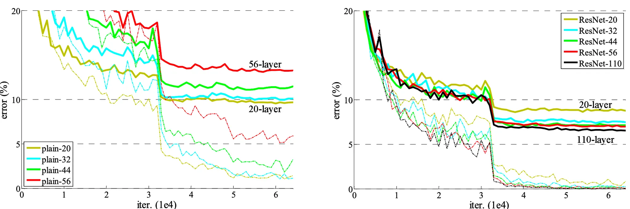 ๋ง์ฐฌ๊ฐ์ง๋ก, ์ด ๊ฒฐ๊ณผ๋ iteration์ ๋ฐ๋ฅธ error์ ๊ทธ๋ํ์์๋ ๊ด์ฐฐํ ์ ์์์ต๋๋ค. PlainNet์ layer๊ฐ ๋ง์ ์๋ก error๊ฐ ์ปธ์ง๋ง, ResNet์ layer๊ฐ ๋ง์ ์๋ก error๊ฐ ์์์ ๋ณด์์ต๋๋ค.