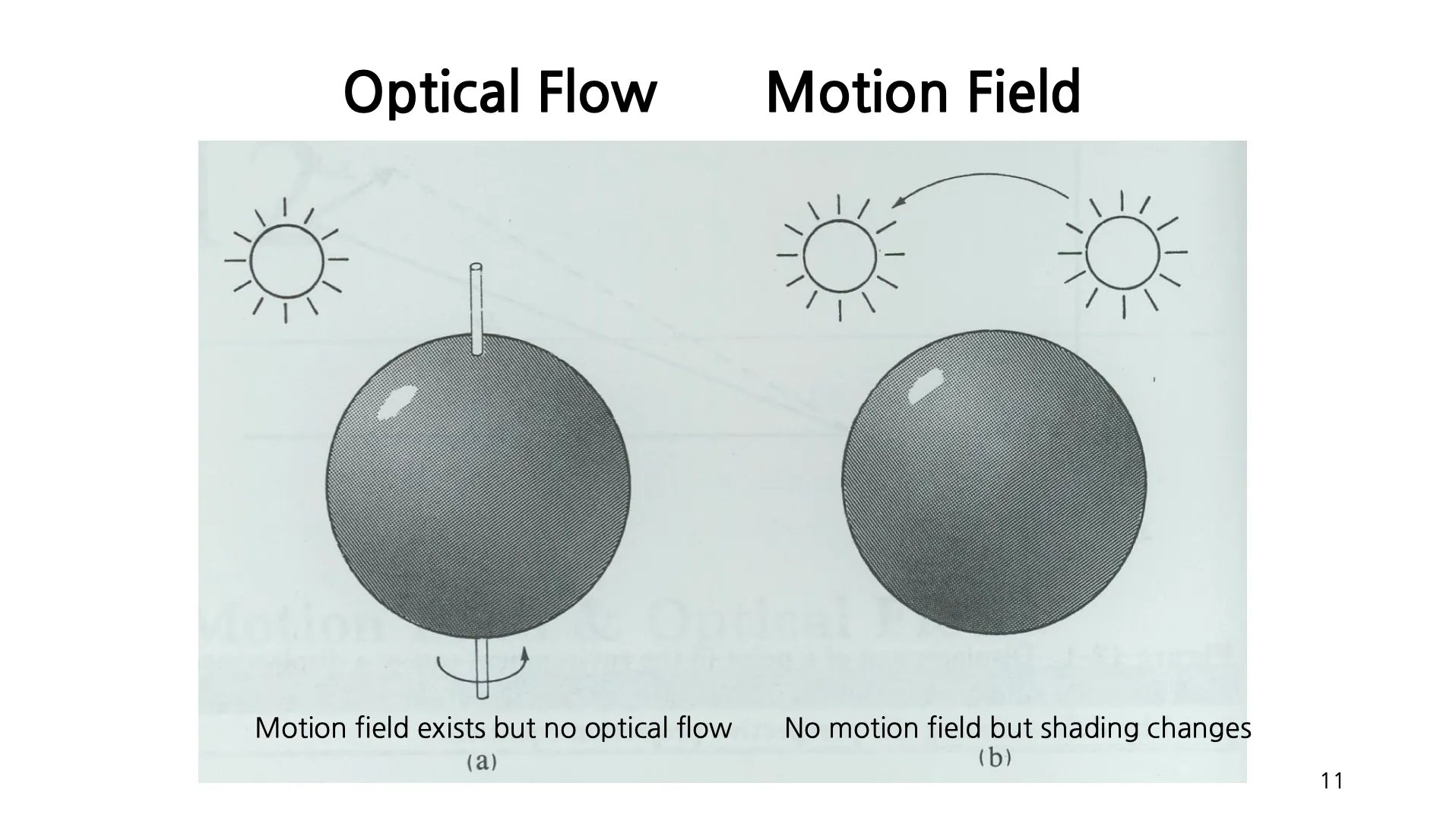 Motion Field 는 존재하지 않으나 (속도가 0) Optical Flow 는 존재함 (보이는 것의 차이 O)