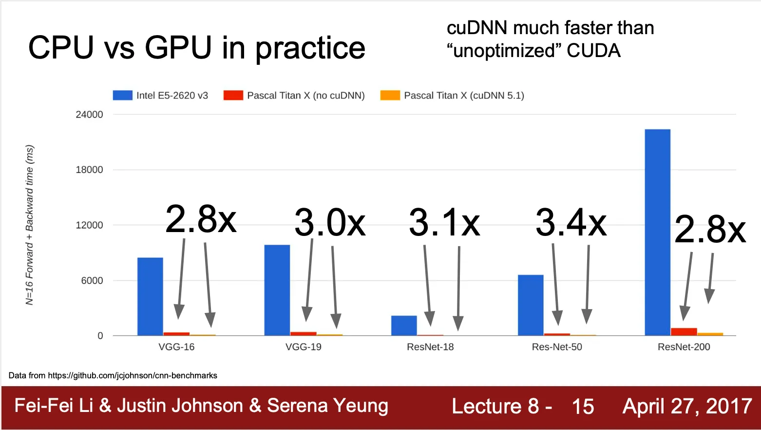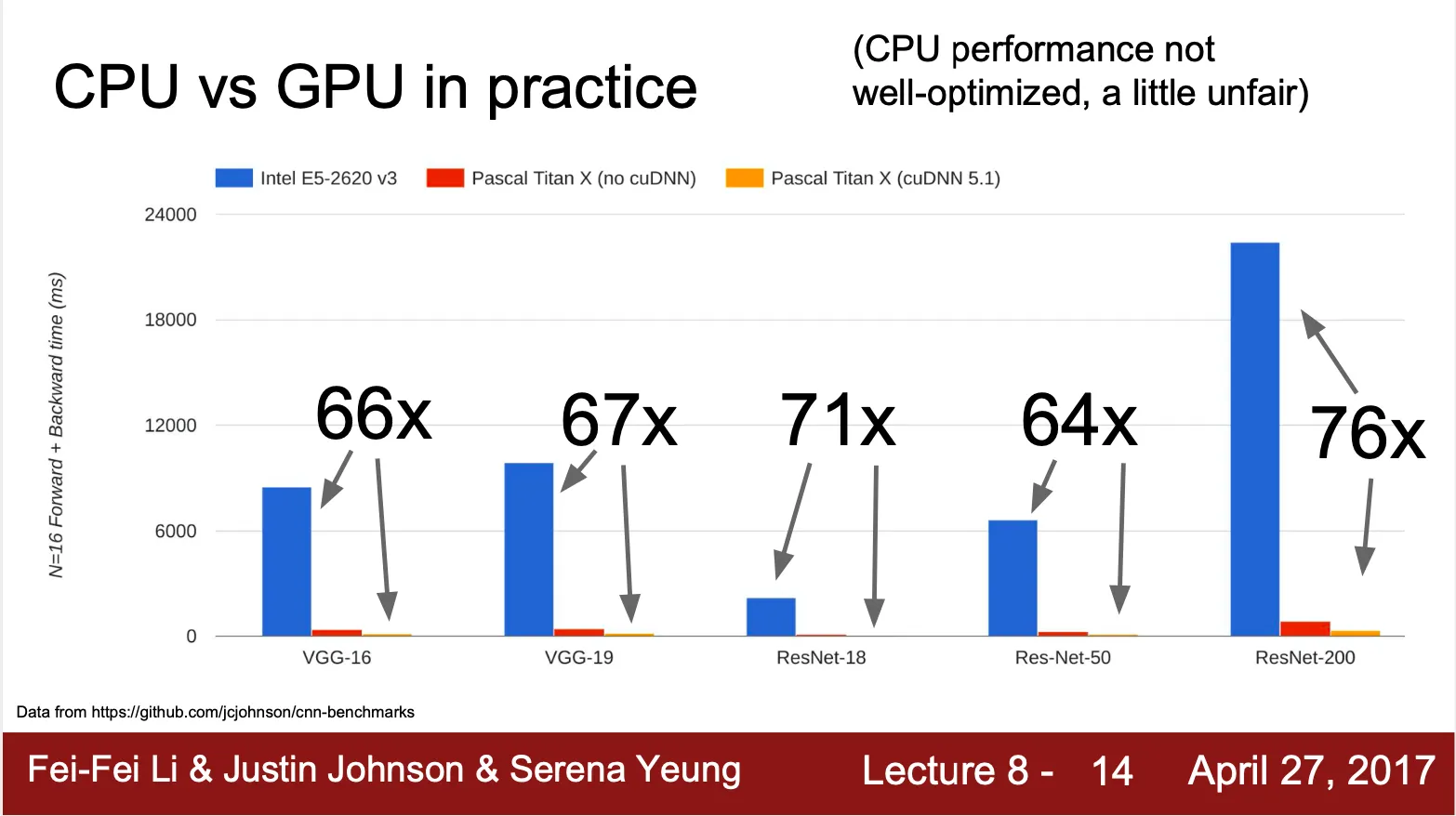 때문에 deep Learning 에서 GPU 가 통상적으로 CPU 보다 6~70 배 빠르고, 같은 GPU 더라도 highly optimized 된 computational primitives 의 사용 여하에 따라 3배 정도 차이가 남