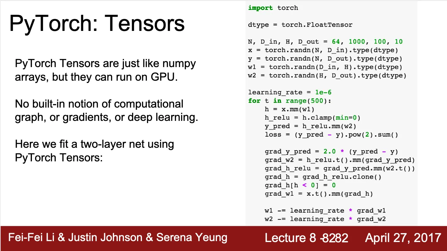Tensor 선언, forward pass, backward pass, gradient step 으로 나누어져 있음