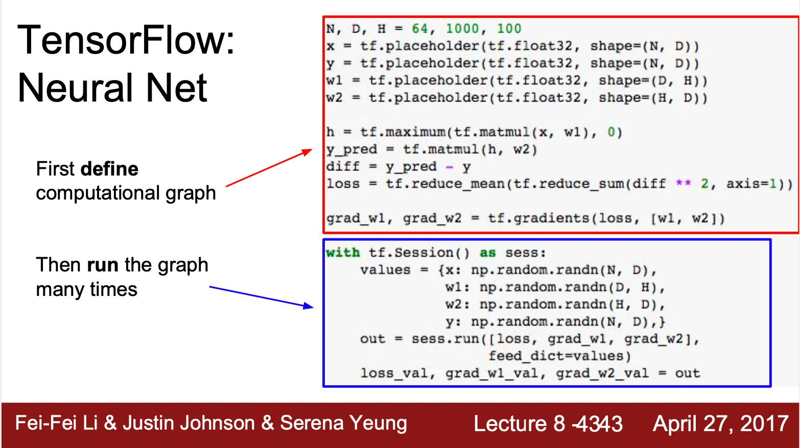 Computational graph 를 정의하는 부분과 graph 를 지속적으로 지나는 부분으로 나누어져 있음