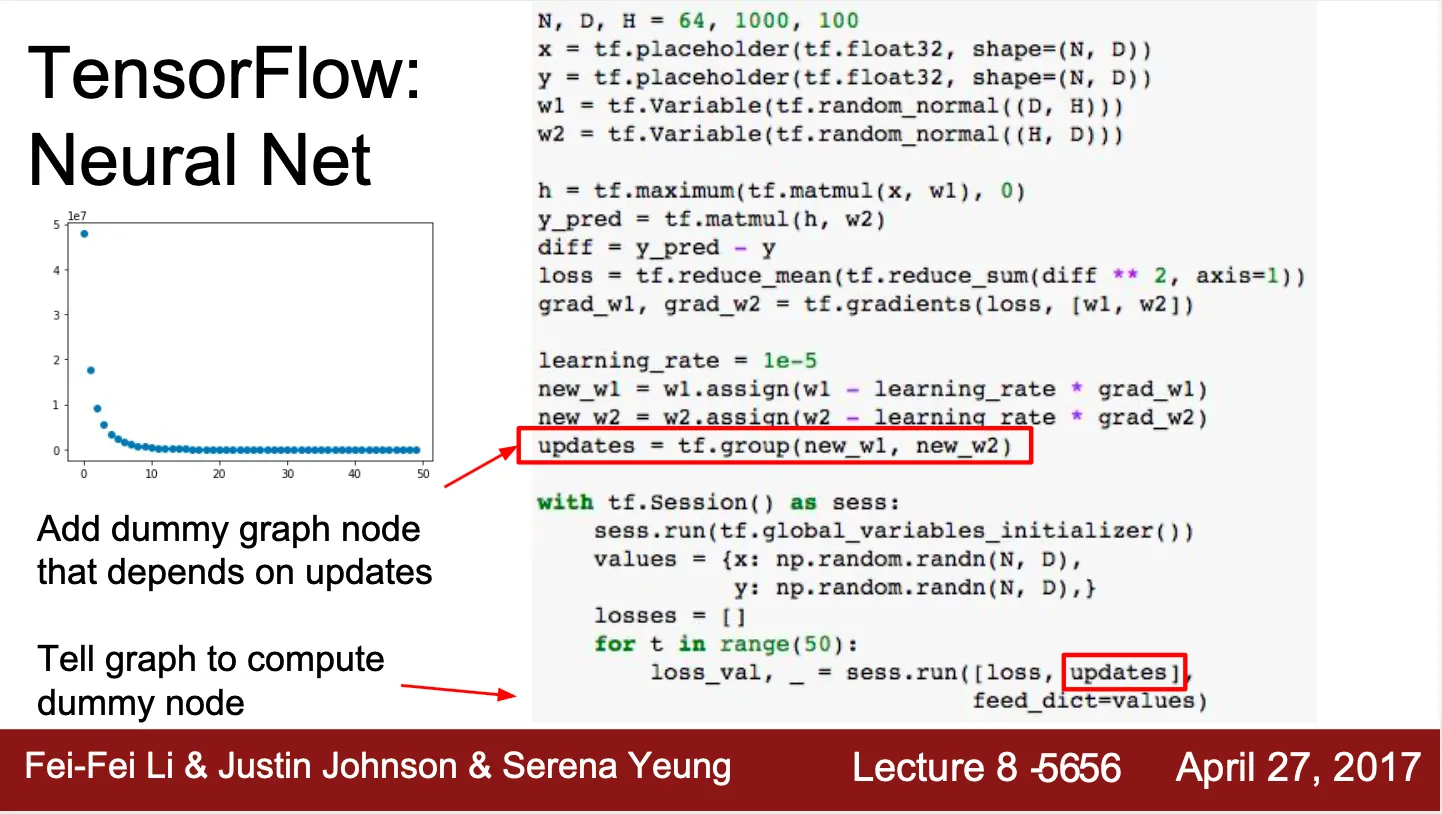 하지만, TensorFlow 는 불필요한 계산을 하지 않기 때문에 new_w1, new_w2 를 계산하는 것을 명시적으로 진행해야 함