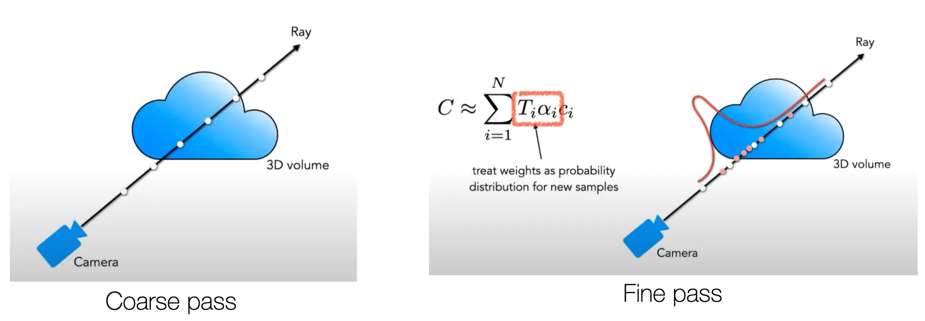 Fine pass 로 sampling 할 때 volume density + transparency 기반으로 probability 를 주어 sampling 을 할 수 있음.