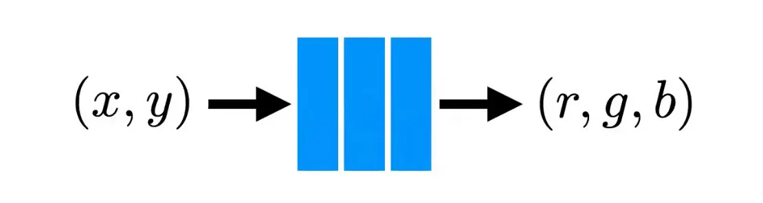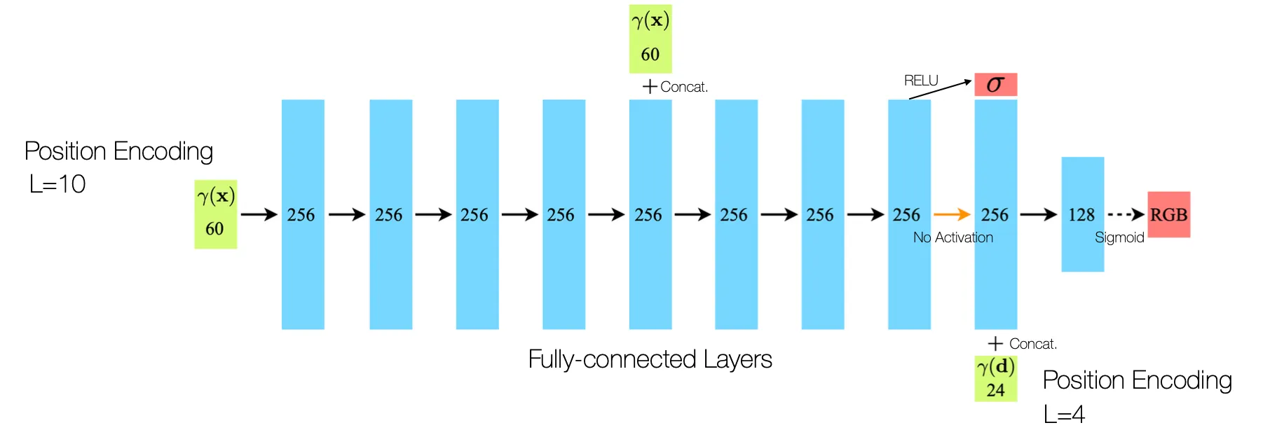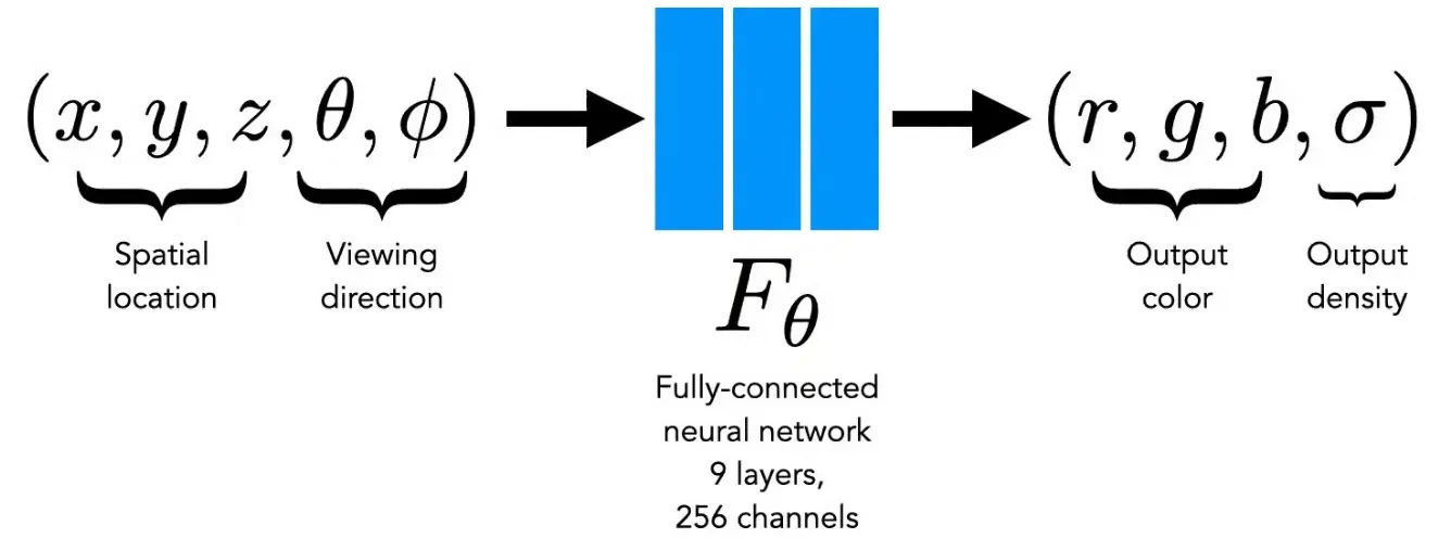 Spatial Location 과 view direction 을 입력으로 받아서 output color 와 output density 를 출력으로 내는 네트워크