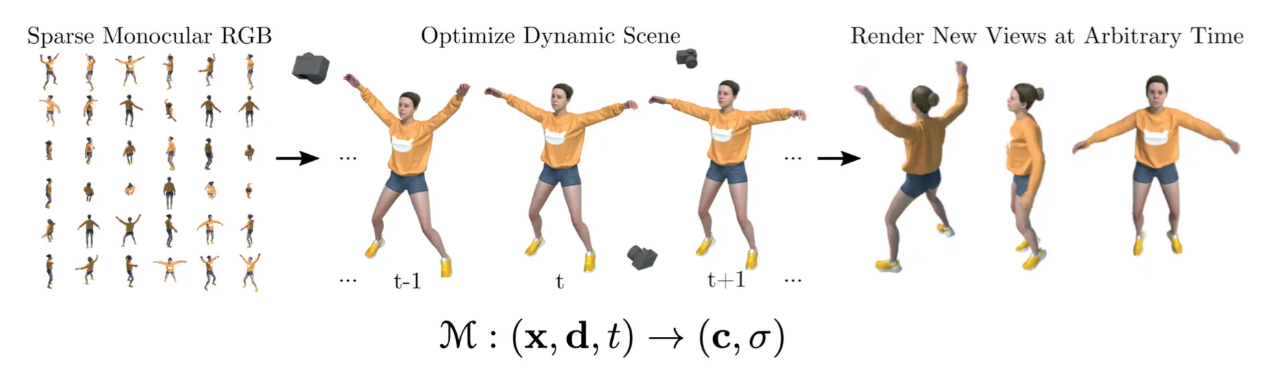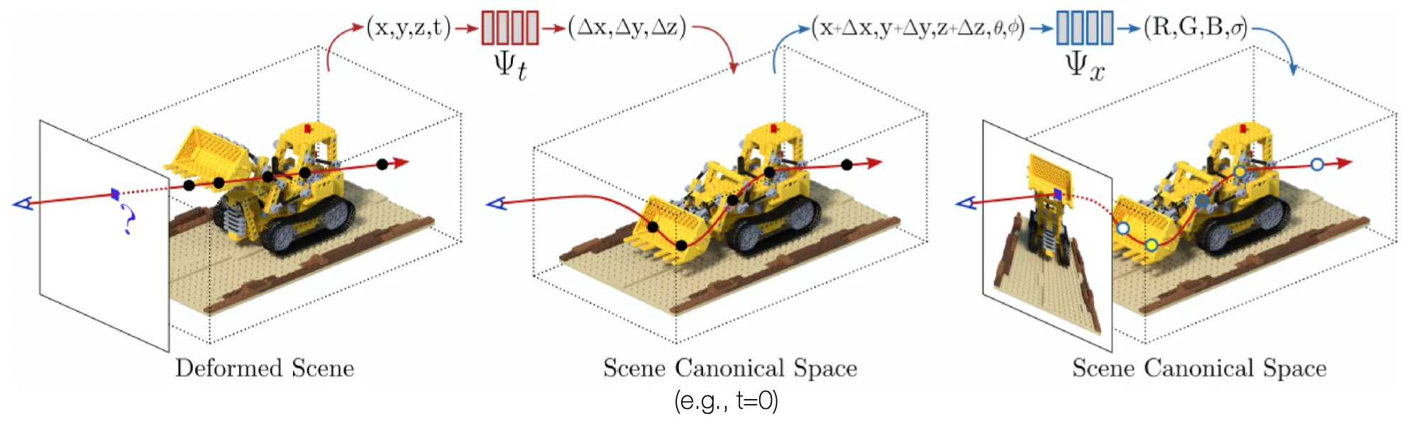 먼저 시간까지 입력으로 넣어 Canonical Space 로의 mapping 에 필요한 변화를 뽑아낸 뒤에, 기존 NeRF 파이프라인을 활용함.