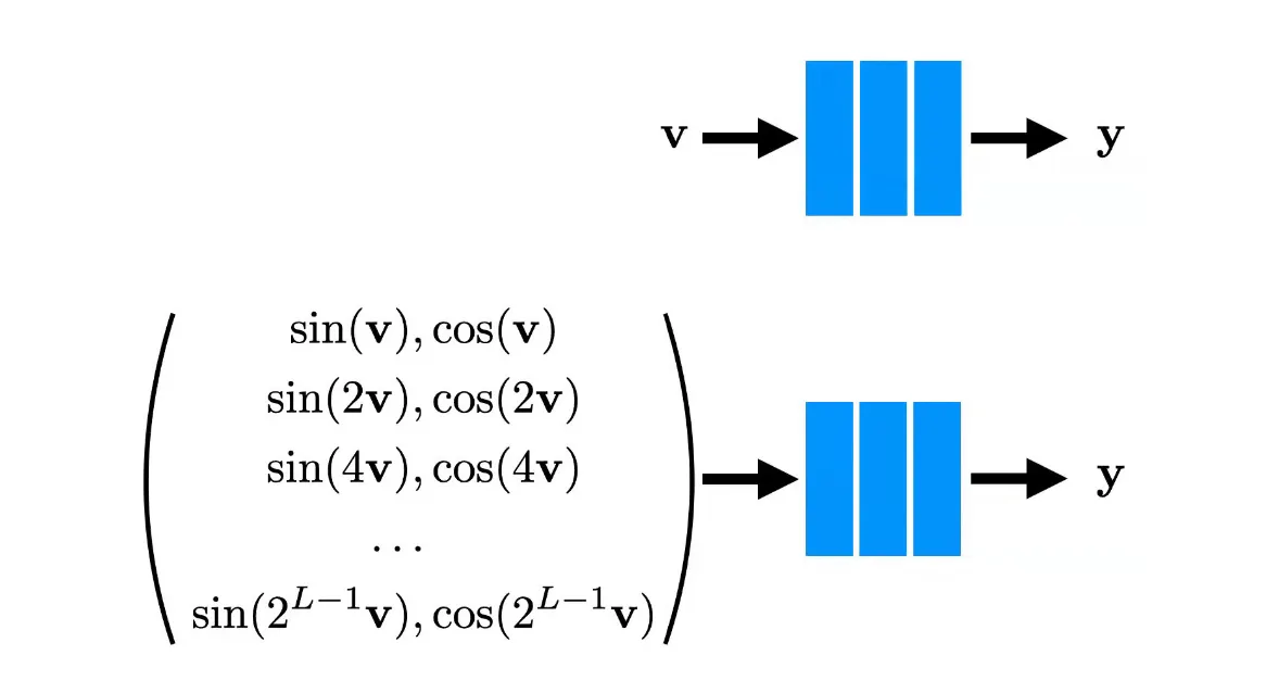 이 positional encoding 이 major contribution 이며, transformer 가 이런 encoding 을 position 식별을 위해 사용했다면, 여기서는 high dimension mapping 을 위해 사용함.