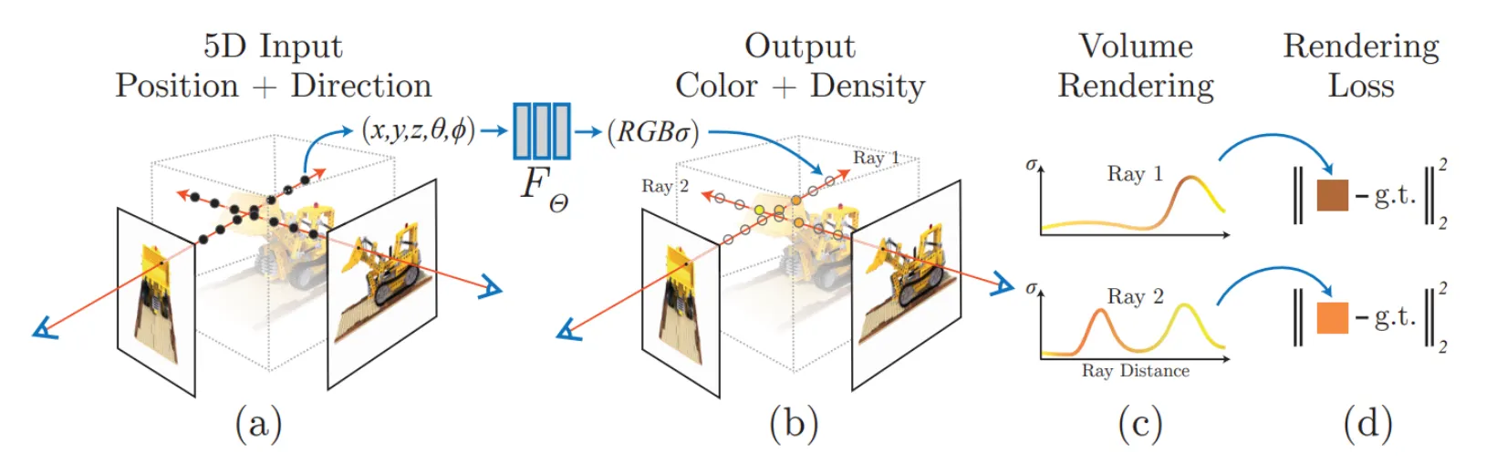 각각의 ray 에 대해서 pixel 에 ray 를 rendering 하고, pixel reconstruction error 를 최소화하는 방향으로 학습을 진행함.