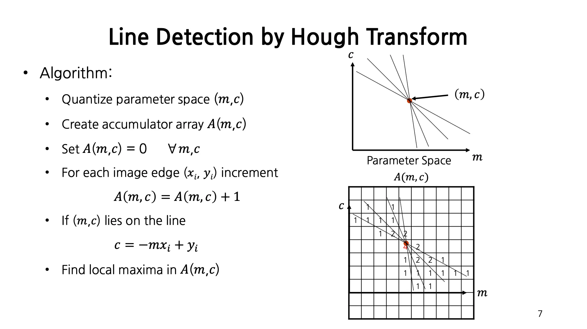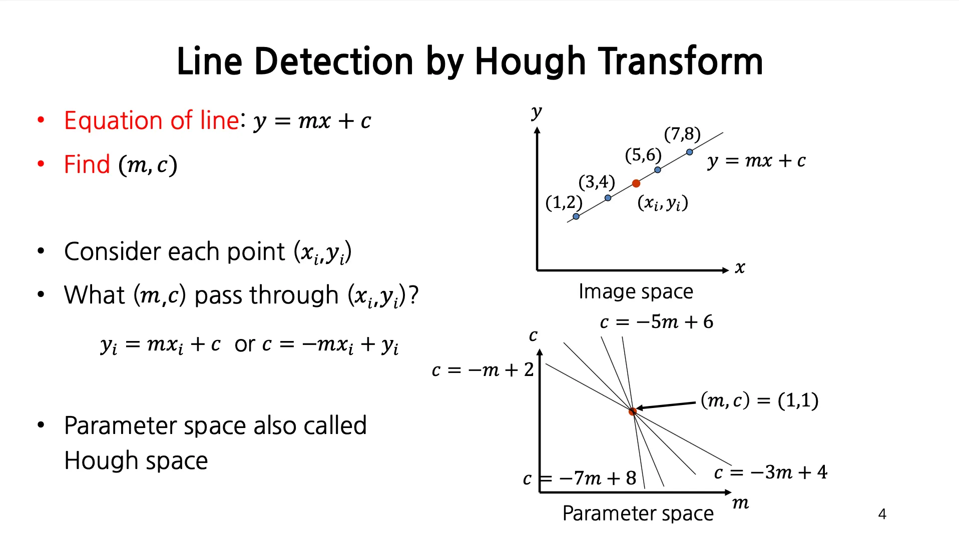 Image Space 에서 점 하나가 Parameter Space (Hough Space) 에서 선 하나에 대응됨.
