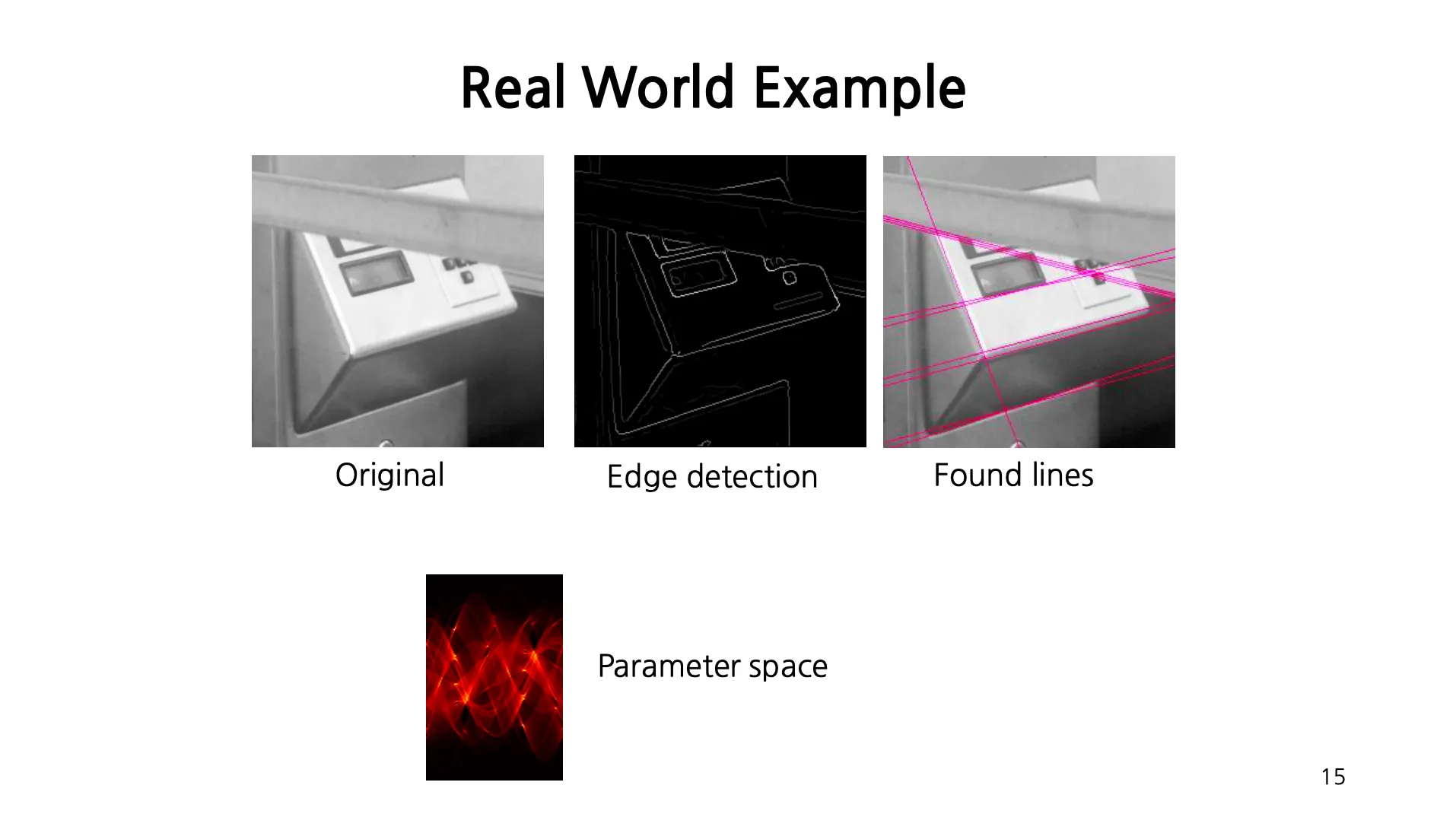 Hough Transformation: Noisy 하거나 끊긴 edge 가 detection 되었을 때, 그것으로부터 line, circle, object 들을 찾아낼 수 있는 알고리즘