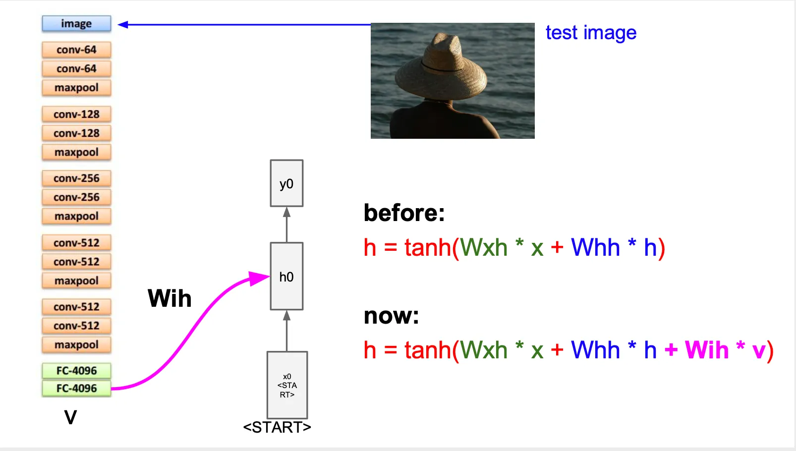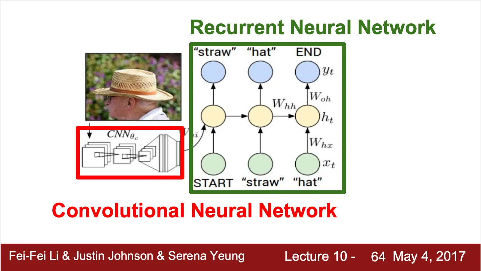 CNN 이 image 에 대한 feature vector 를 산출하고, RNN 이 그 feature vector 를 사용해 caption words 를 sequential 하게 생성