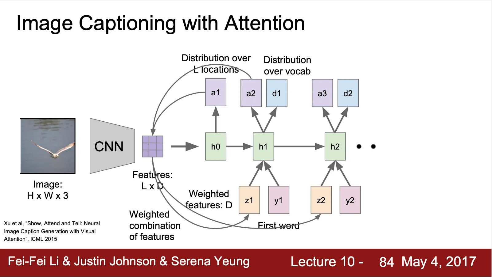 각 time step 마다 vocabulary 를 sampling 하여 산출하는 것 이외에도 이미지 내에서 살펴볼 영역에 distribution 또한 산출