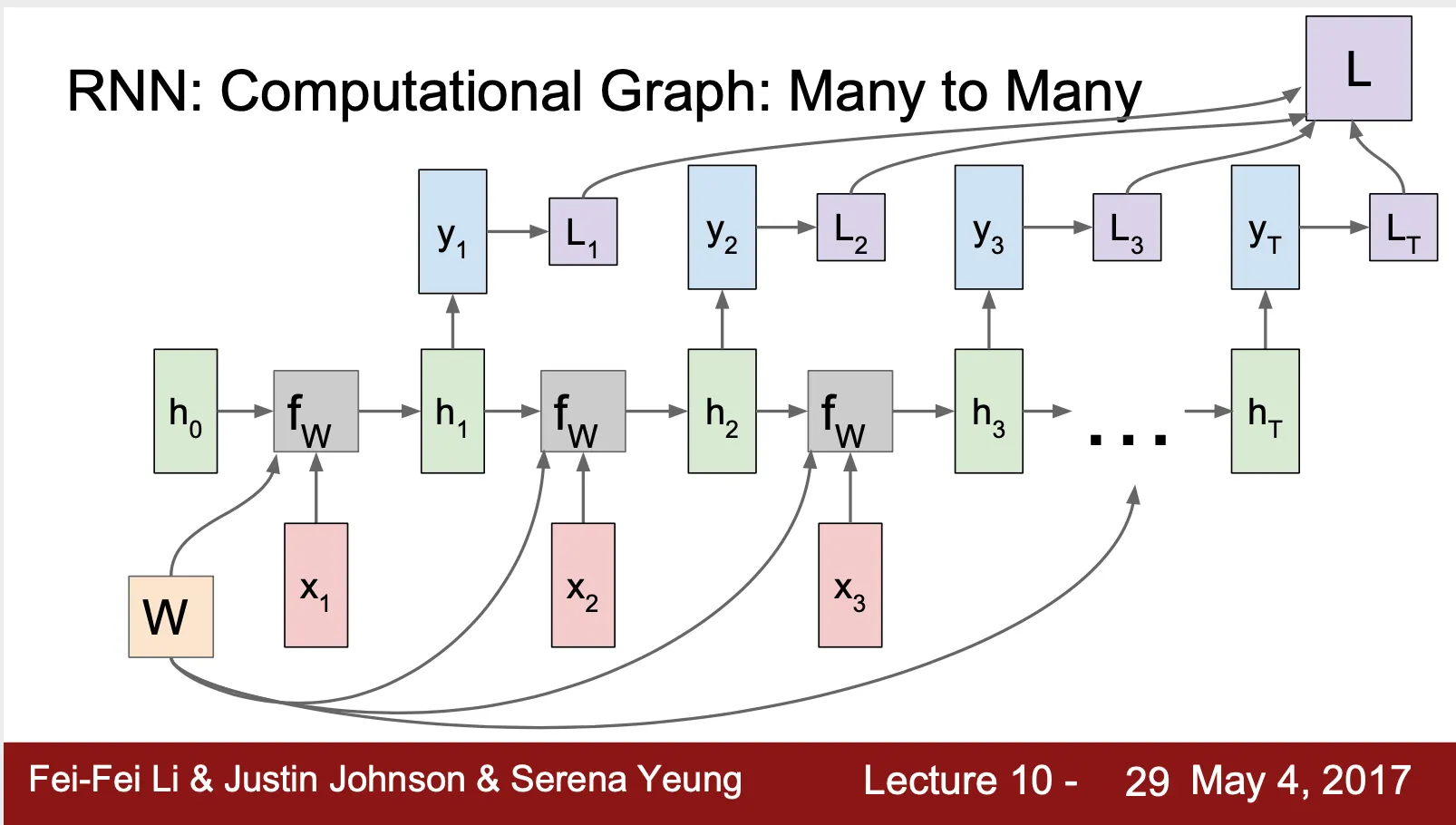 RNN 의 back propagation 은 각 time step 에서의 L 에 대한 W 의 gradient 들의 합
