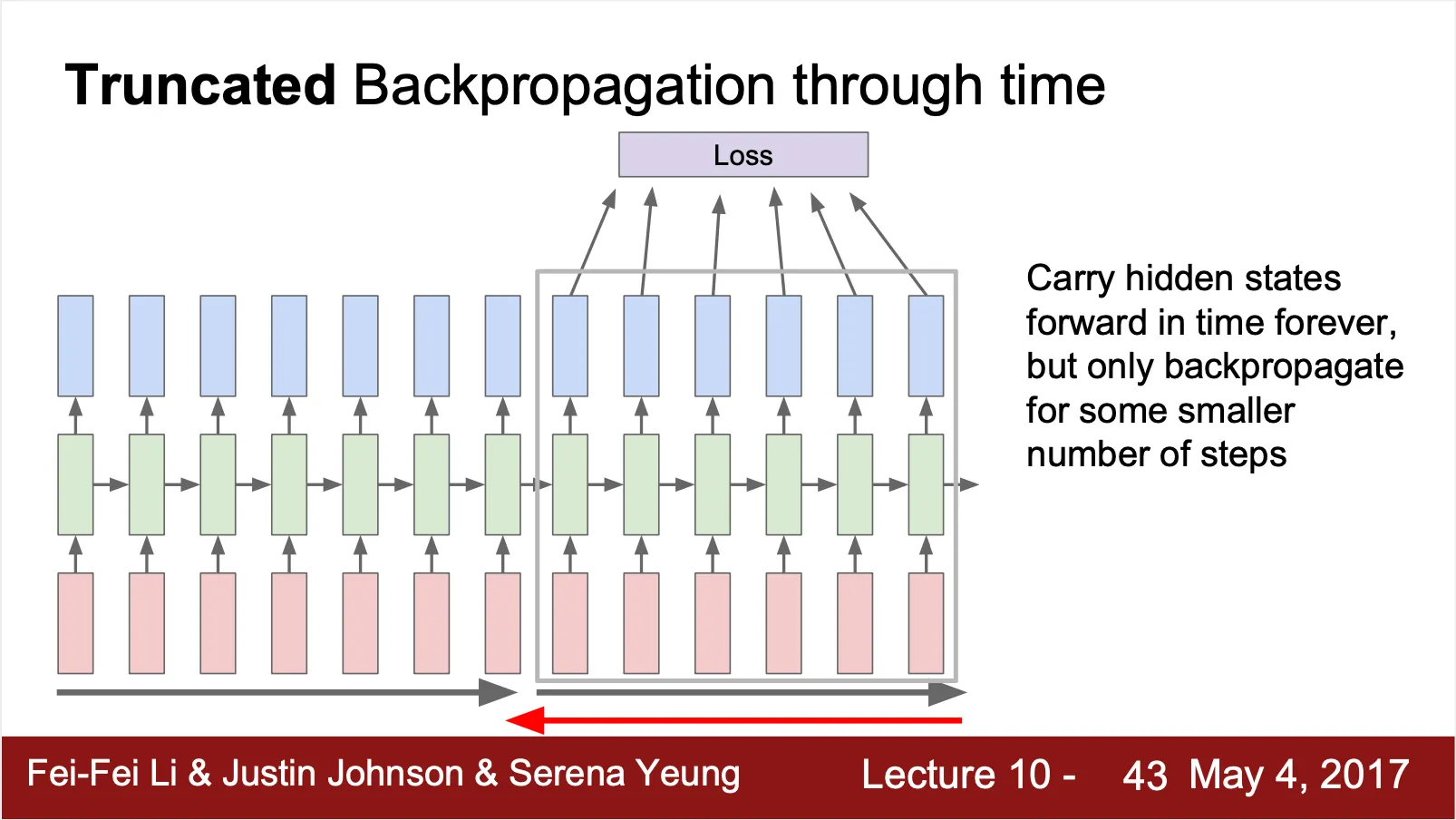 Sequence 가 굉장히 긴 경우, 매우 오래 걸리는 단점이 있음 (sequence 를 forward propagate 해가며 loss 를 구하고 이를 다시 back propagation 하여 update 해야 하기 때문)