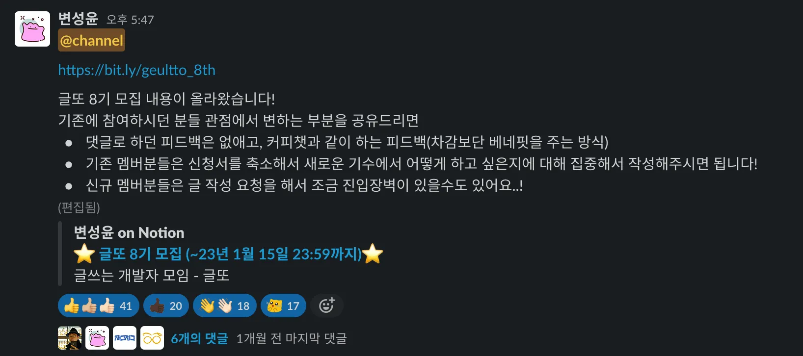 그렇게 시간이 흘러 어느덧 글또 8기의 모집 기간이 되었고 잠시 나태했던 삶을 마무리 짓고 글또 7기에서 이루지 못했던, 글을 쓰는 취미를 가지고 싶다는 큰 꿈을 가지고 다시 글또 8기의 문을 두드렸습니다.