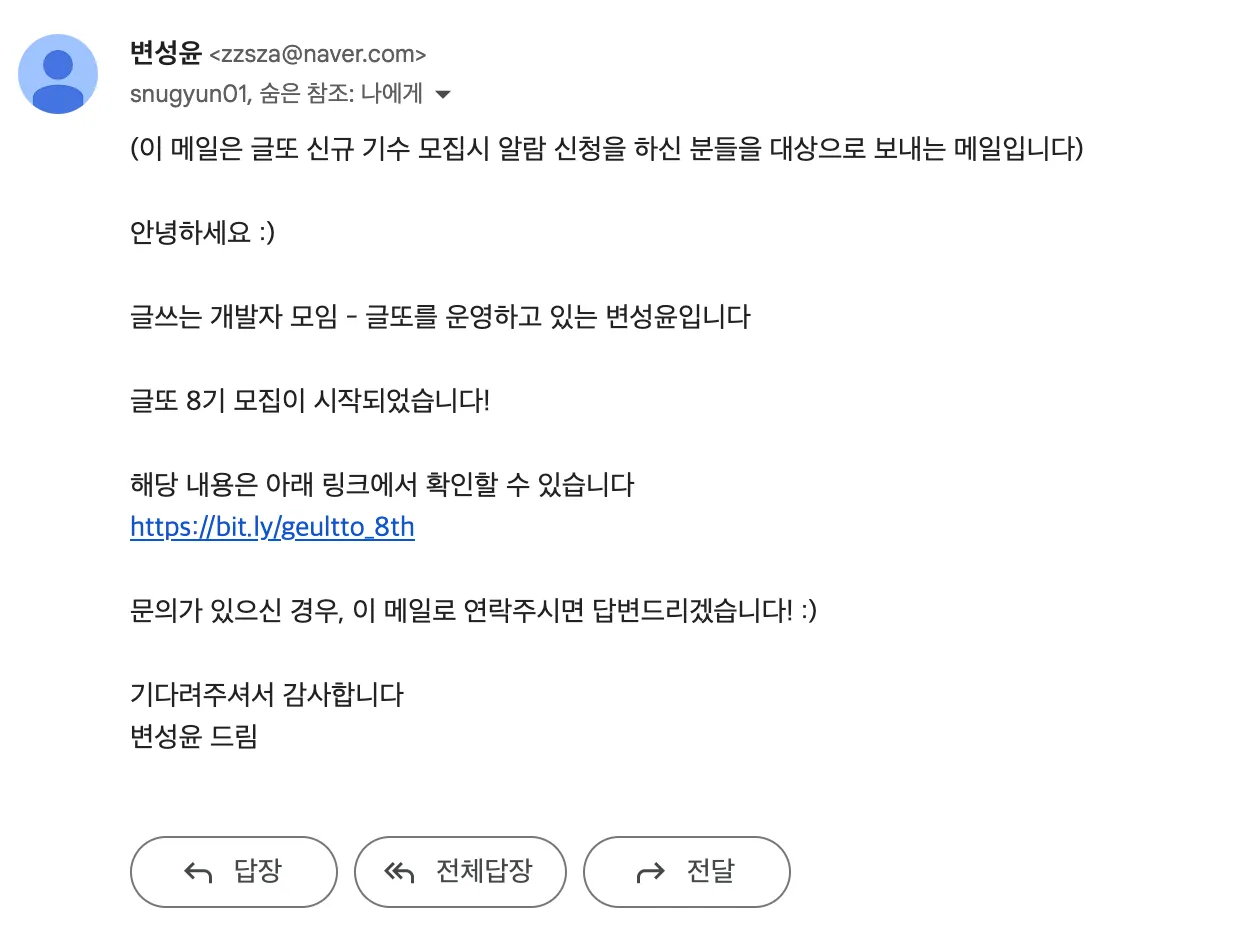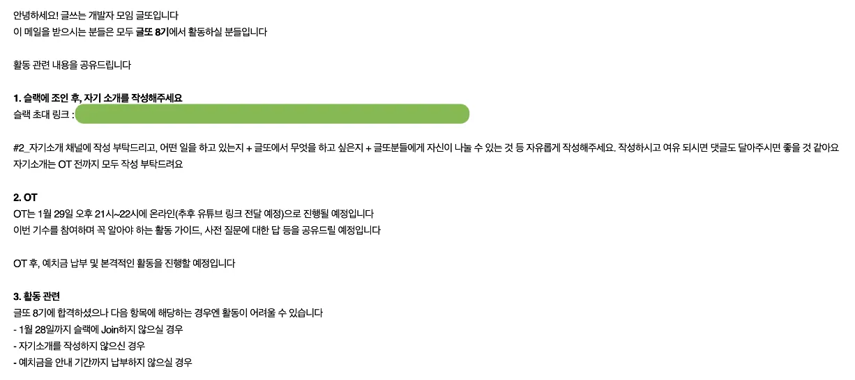 그렇게 시간이 지나, 글또에 지원한 것도 까먹었을 때 즈음 글또 합격 메일이 도착했습니다. 내심 지원할 때 “떨어지는 거 아니야?” 라는 생각도 했었는데, 다행히도 이번에는 이전 기수 활동자들을 모두 다음기수로 합격시켜 준 것 같더라구요.