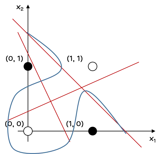 하지만, XOR Gate 는 AND Gate 와는 다르게 어떤 특정한 직선으로 원하는 결과를 양분할 수 없습니다. 정확히 말하면 양분할 수 있는 직선을 찾을 수 없습니다. 위의 그림처럼 어떠한 빨간색 직선을 그려도, 양분된 영역에 같은 색깔의 두 점이 각각씩 포함되게 그릴 수가 없습니다. 때문에, 직선이 아닌 어떤 파란색 선과 같은 선으로 이 영역을 양분해야 겠다는 생각이 들었고, 이를 위해서 모델은 조금 더 복잡한 함수를 구현해야 했으며 Hidden Cell 을 추가하게 된 것입니다.