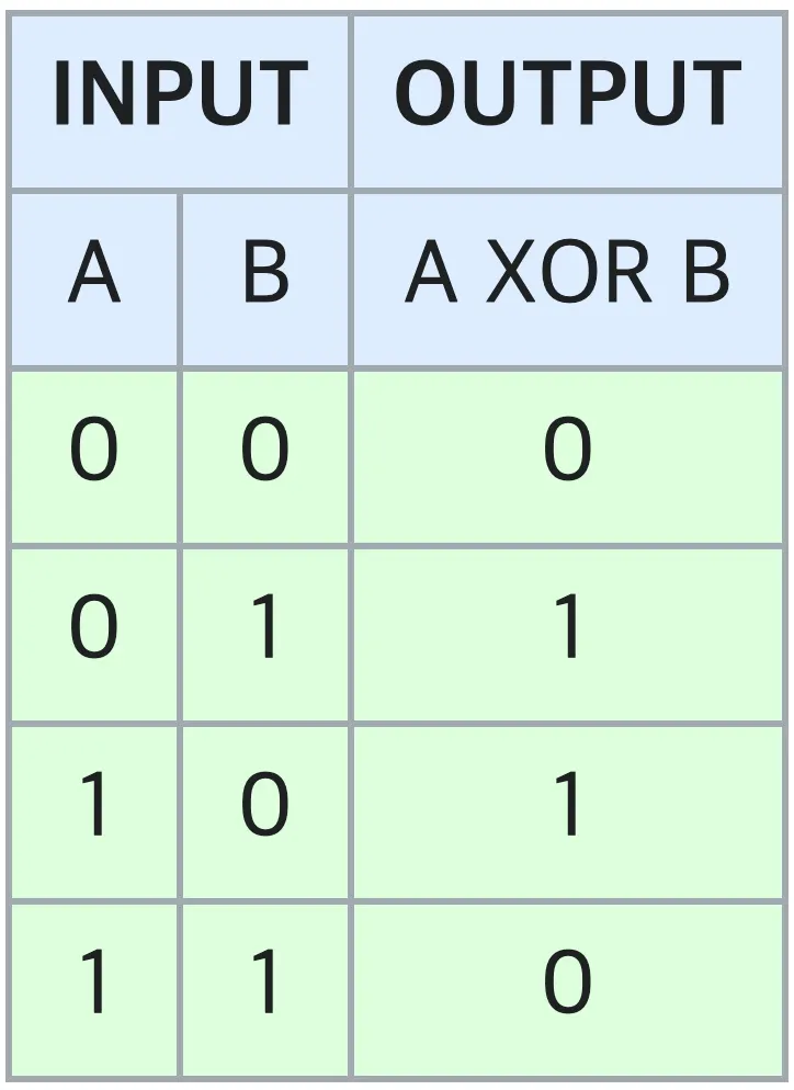 XOR Gate 는 흔히 입력의 개수 중 True(참, 1) 인 것이 홀수 개 있으면 True(참, 1) 을 반환하는 논리 연산입니다. 입력이 두 개일 경우에는 특별히 서로 다른 두 논리가 들어왔을 때만 True(참, 1) 을 산출하고 같은 논리가 들어왔을 때는 False(거짓, 0) 을 산출하는 것으로도 해석할 수 있습니다. 도표로 표현하면 다음과 같습니다.